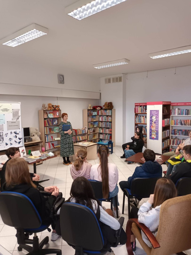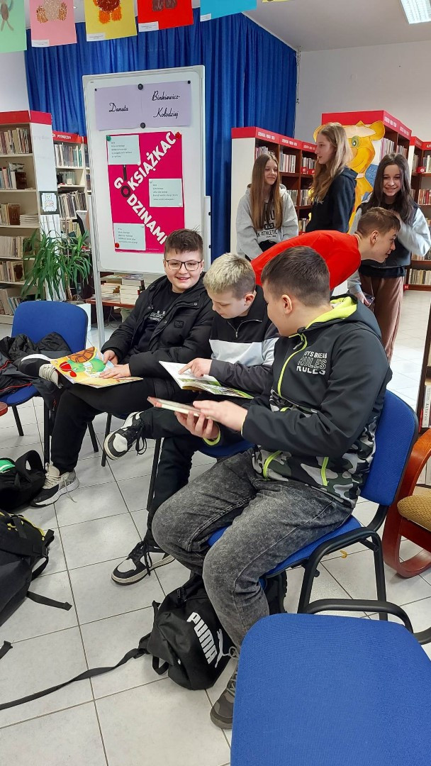 Młodzież zwiedziła bibliotekę, oglądała zbiory biblioteczne, a niektórzy wypożyczyli książki.