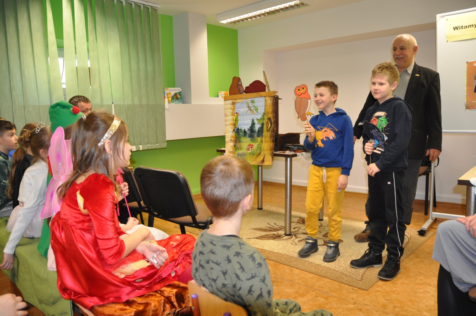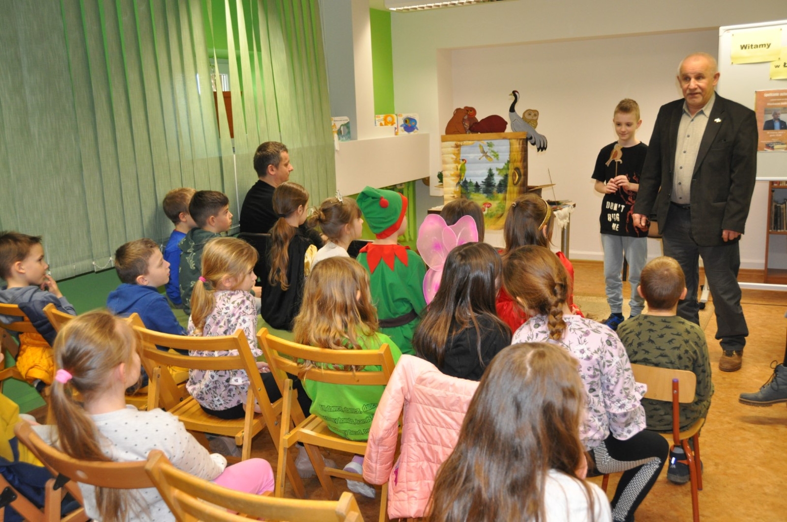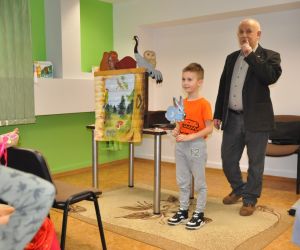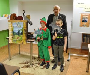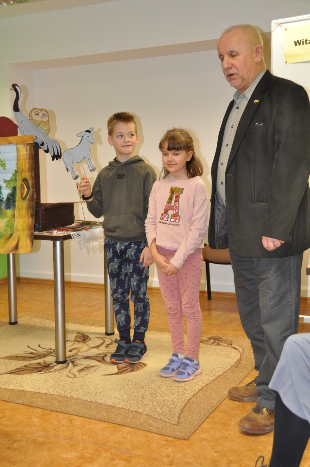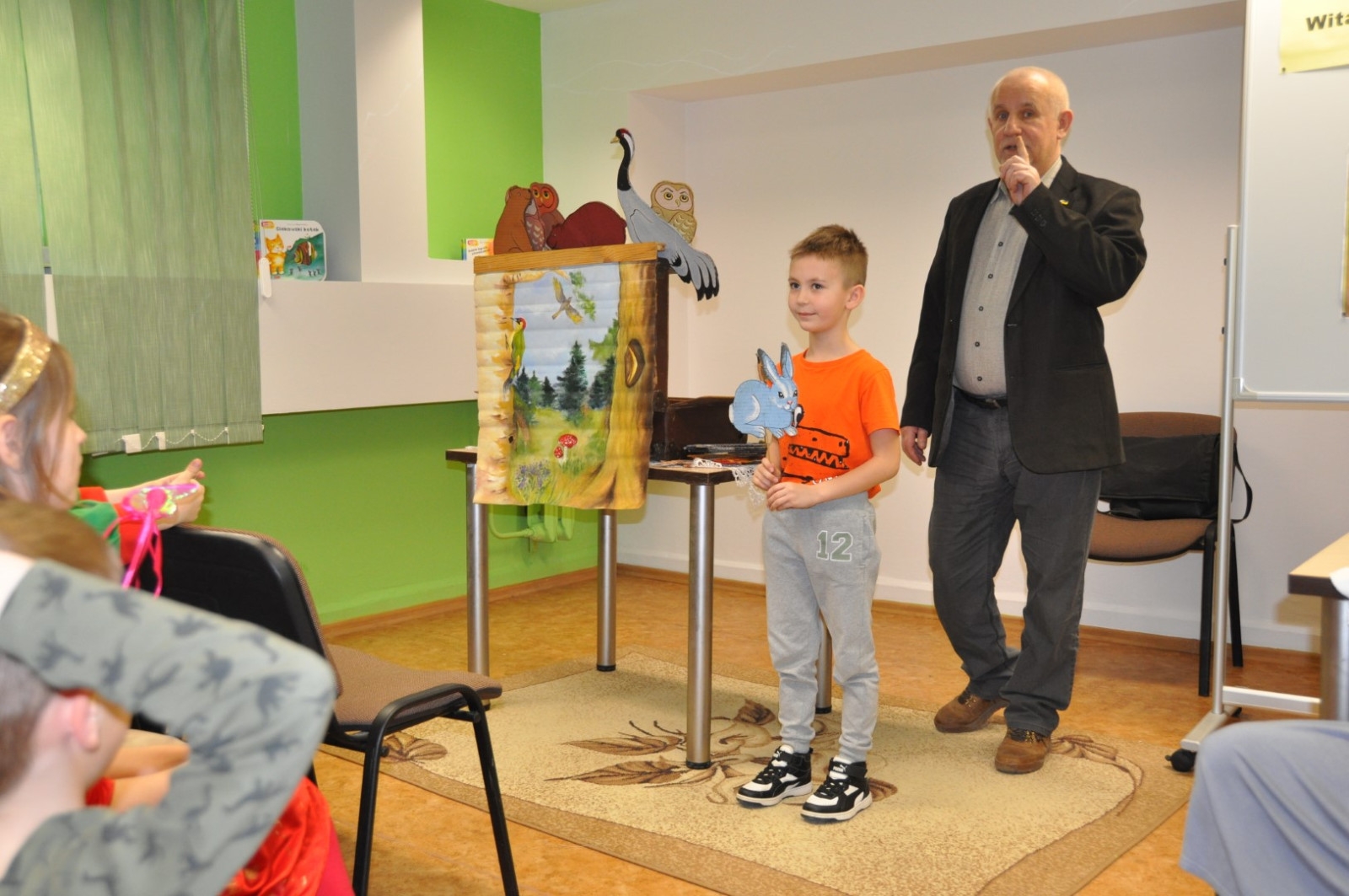 Każdy uczestnik mógł na żywo wziąć udział w recytacji wiersza i asystować autorowi w prezentowaniu utworów z użyciem ciekawych rekwizytów ptaków i zwierząt. Nasz gość zachęcił wszystkich do aktywnego udziału w spotkaniu poprzez piękne recytacje wierszy i limeryków. Mali słuchacze z podziwem słuchali bajek i utworów i zadawali pytania.
