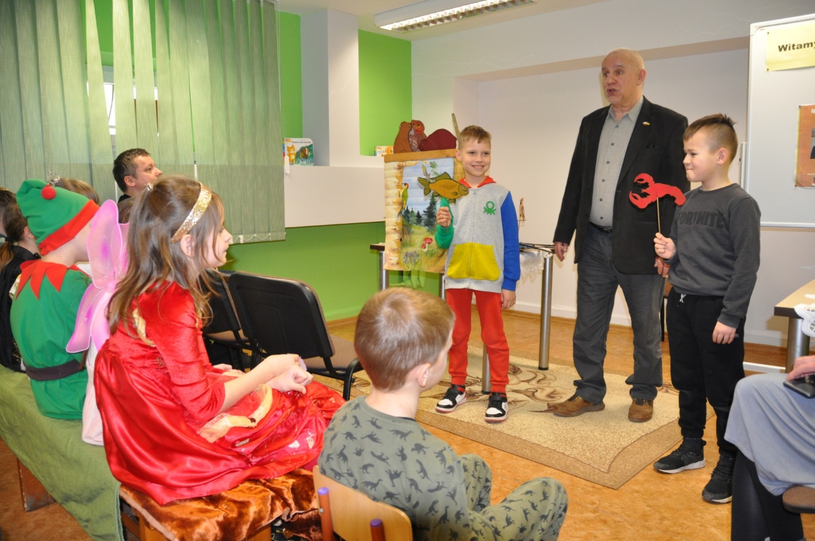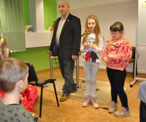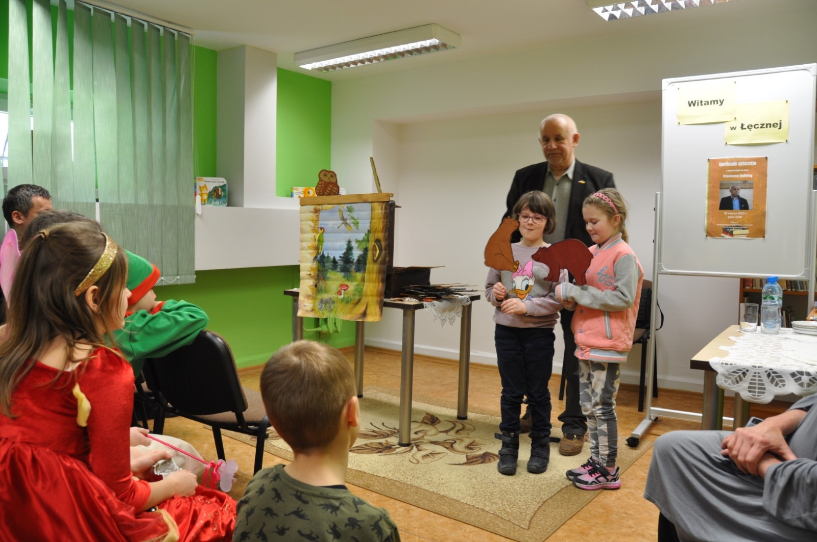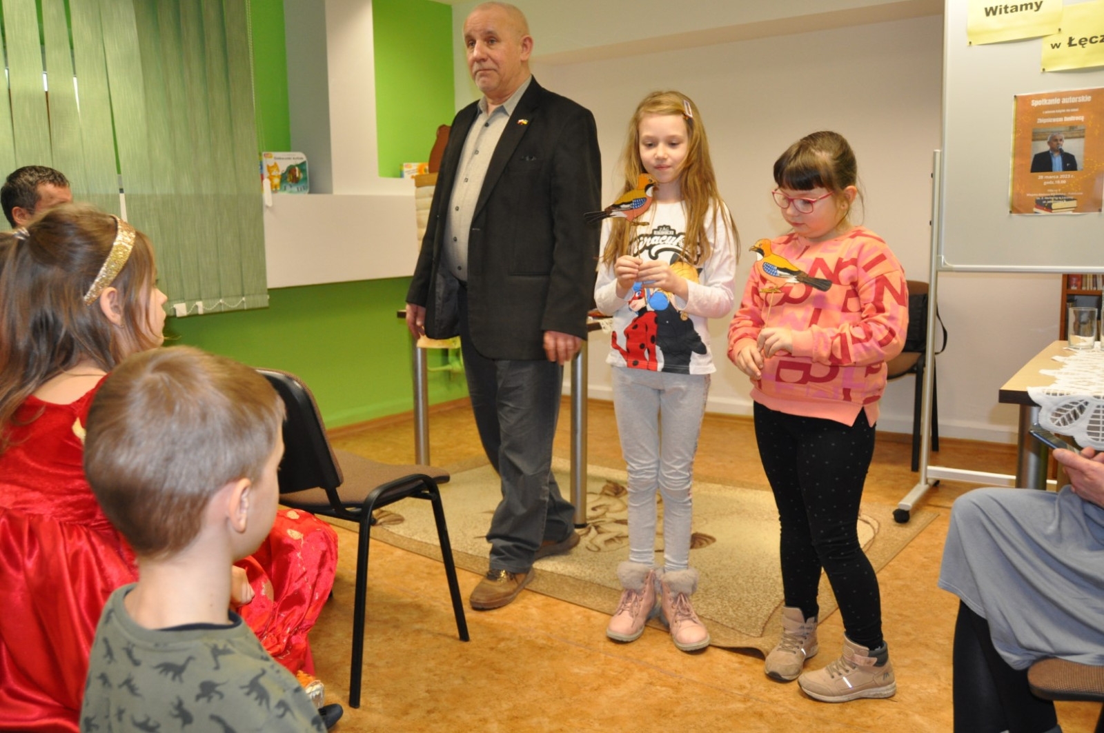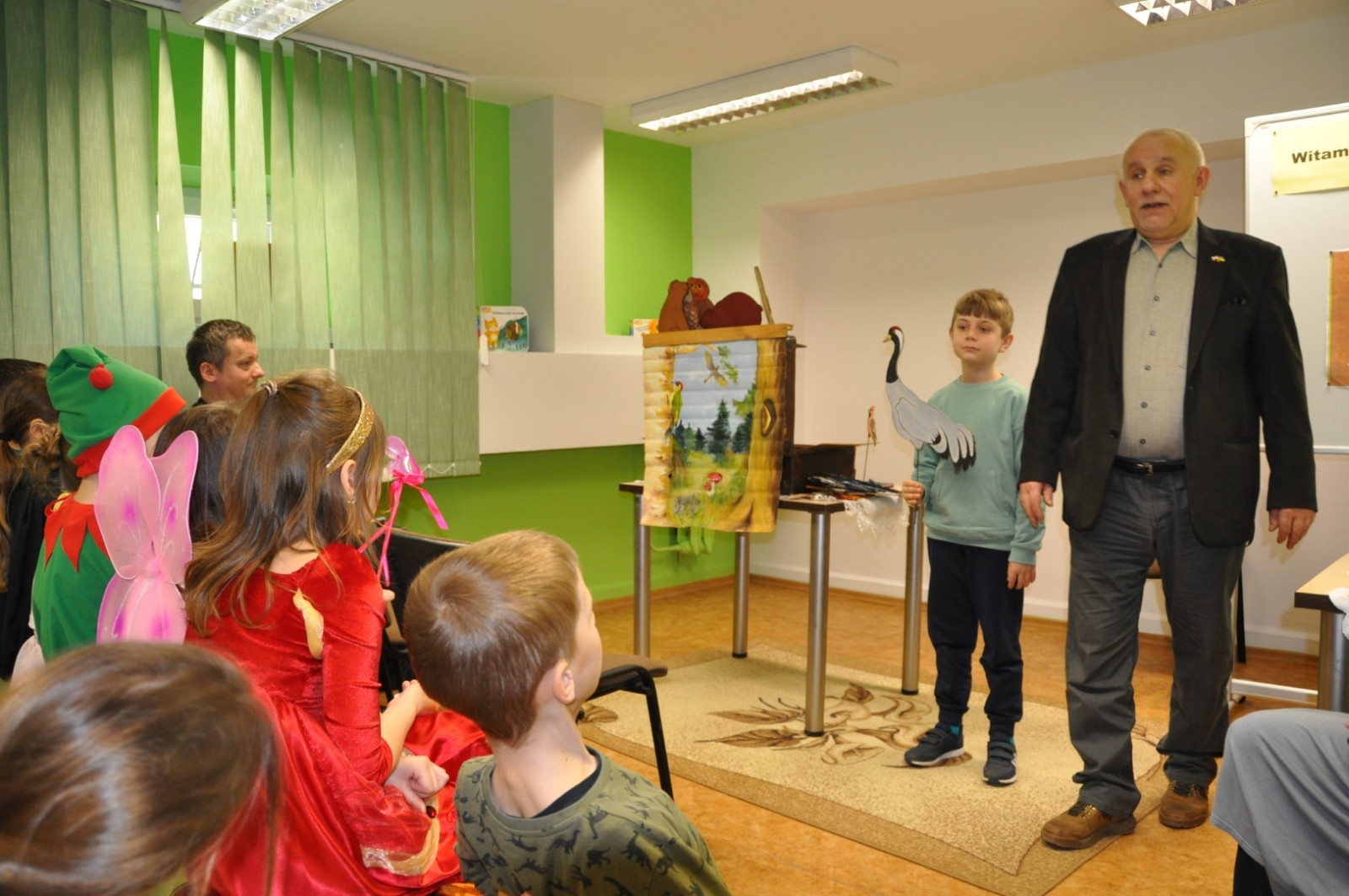 Każdy uczestnik mógł na żywo wziąć udział w recytacji wiersza i asystować autorowi w prezentowaniu utworów z użyciem ciekawych rekwizytów ptaków i zwierząt. Nasz gość zachęcił wszystkich do aktywnego udziału w spotkaniu poprzez piękne recytacje wierszy i limeryków. Mali słuchacze z podziwem słuchali bajek i utworów i zadawali pytania.