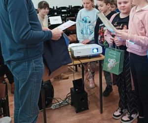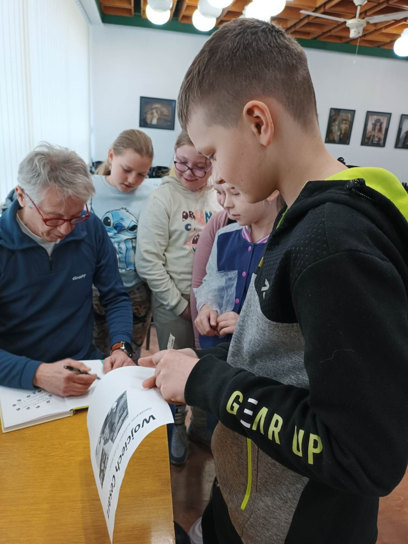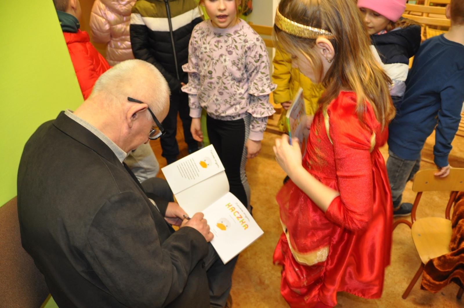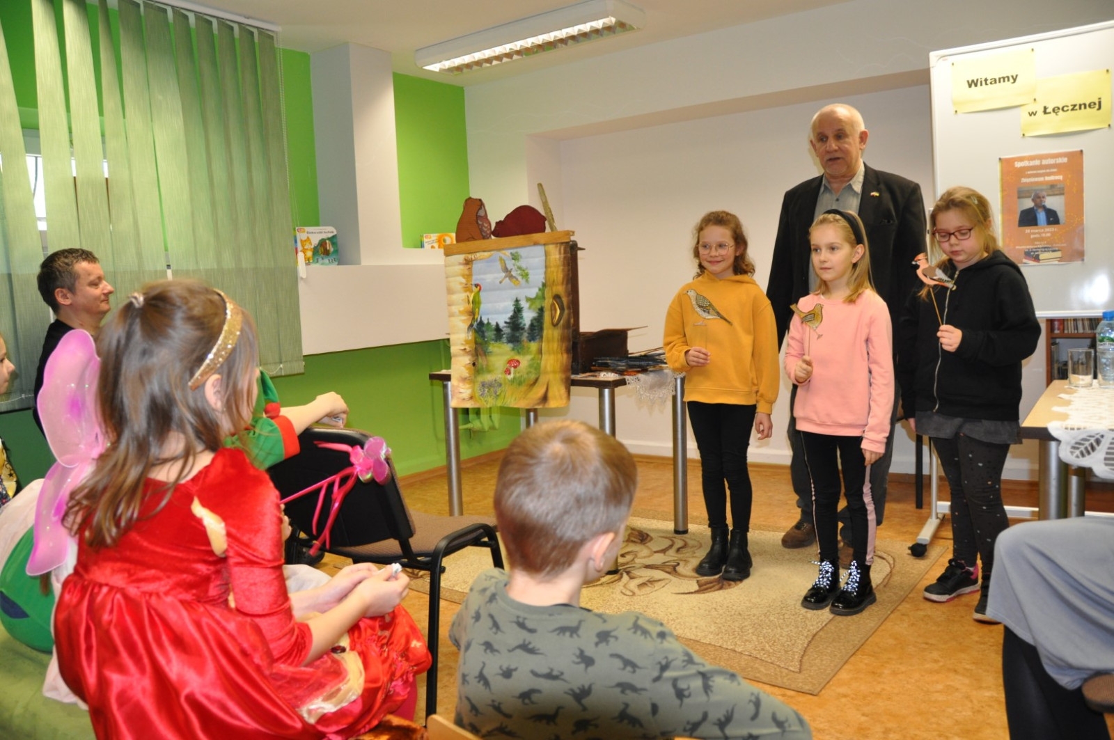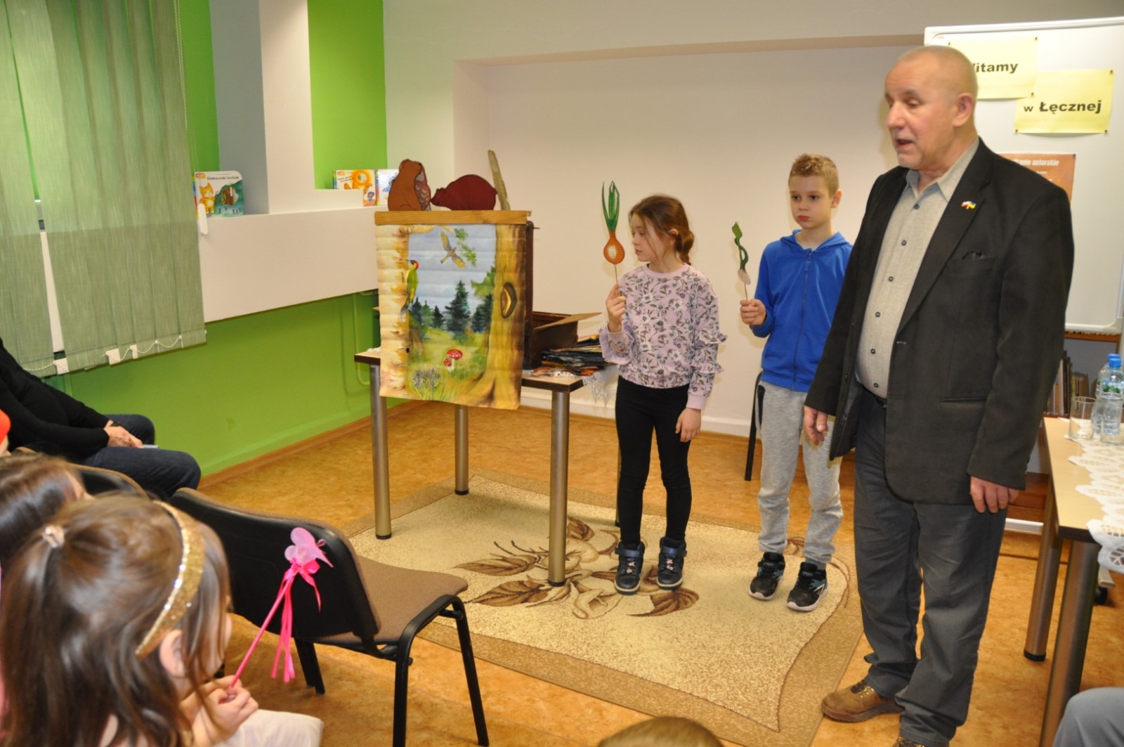Każdy uczestnik mógł na żywo wziąć udział w recytacji wiersza i asystować autorowi w prezentowaniu utworów z użyciem ciekawych rekwizytów ptaków i zwierząt. Nasz gość zachęcił wszystkich do aktywnego udziału w spotkaniu poprzez piękne recytacje wierszy i limeryków. Mali słuchacze z podziwem słuchali bajek i utworów i zadawali pytania.