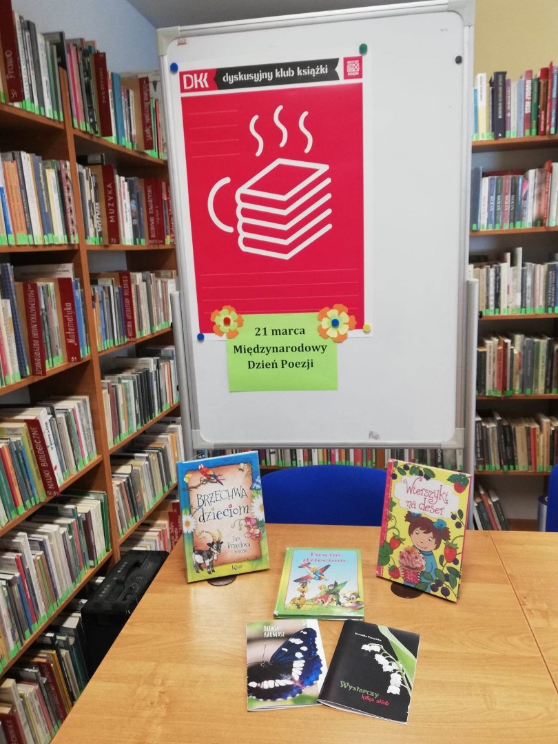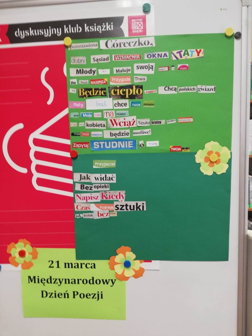 Nawiązując do Międzynarodowego Dnia Poezji, który przypada 21.03 Dyskusyjny Klub Książki działający w Filii nr 1 włączył się w jego obchody w dniu 24 marca. Członkowie Klubu świetnie bawili się czytając znane wiersze Juliana Tuwima i Jana Brzechwy. Była to też okazja by zapoznać się z twórczością młodych, zdolnych łęczyńskich poetek zrzeszonych w „Kocyku Literackim” działającym przy Szkole Podstawowej nr 2. Podczas zajęć nasi klubowicze mieli okazję wykazać się pomysłowością i kreatywnością, gdyż sami zabawili się w pisarzy-poetów. Mieli bowiem za zadanie ułożyć z przypadkowo wyciętych słów z popularnych czasopism swój wiersz. Udało nam się stworzyć z tej wyrazowej rozsypanki dwa teksty.