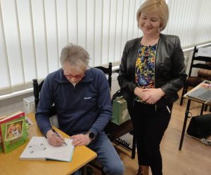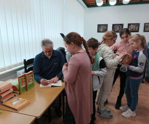 Na zakończenie każdy mógł kupić książkę z autografem autora. Uczniowie klasy II b pod kierunkiem pani Wioletty Tchórzewskiej przygotowali niespodziankę dla naszego gościa w postaci wystawy ilustracji do ulubionych wierszy i poznanych utworów oraz pięknie wyrecytowali wiersz pt.: „Skąd się biorą bajki”.