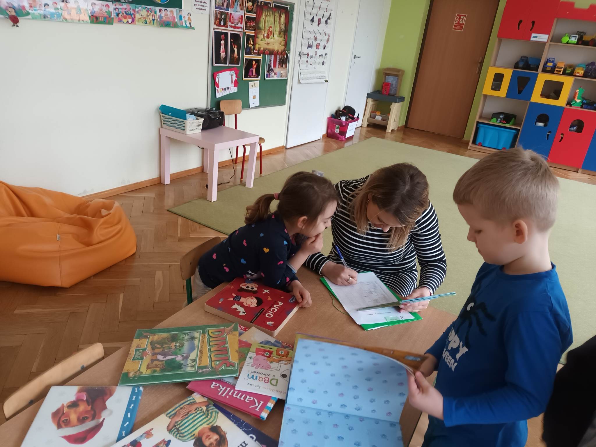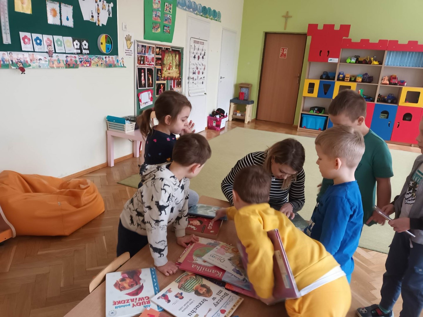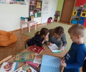 Podczas spotkania, w ramach akcji „Koszyk z książkami” dzieci z grupy „Biedronki” wysłuchały wiersza Kaliny Rokosz pt. „Wierszyk o teatrze-Magiczne miejsce” oraz opowiadania Urszuli Piotrowskiej „Idziemy do teatru”. Przedszkolaki chętnie wymieniły się swoimi spostrzeżeniami z ostatniej wycieczki do teatru. Na zakończenie wizyty, dzieci wypożyczyły książki.