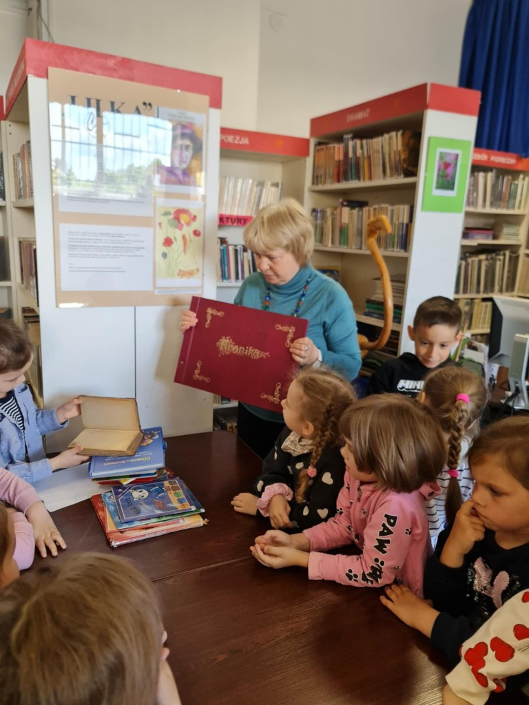 Następnie bibliotekarka przeczytała przedszkolakom książkę pt. „Franklin i książka z biblioteki”, która w przystępny sposób pokazała, jak ważne jest odpowiednie obchodzenie się z książkami. Dzieci wysłuchały również „Bajki o książeczce, co w Łęcznej mieszkała”, co dodatkowo rozbudziło ich wyobraźnię i ciekawość.
