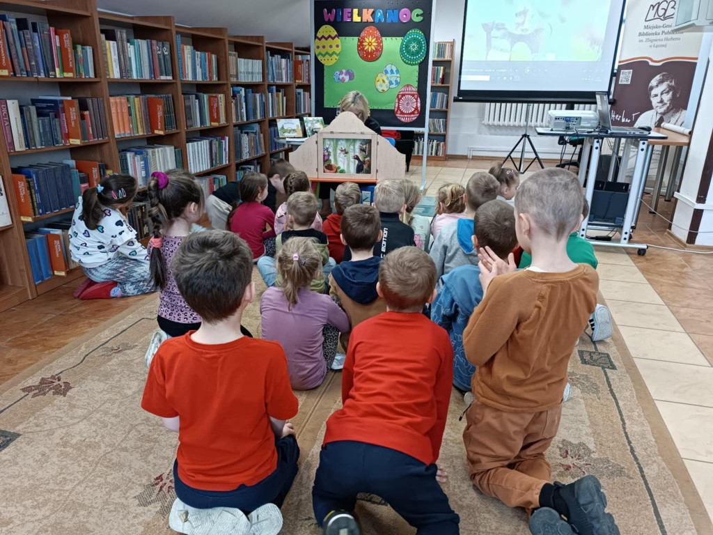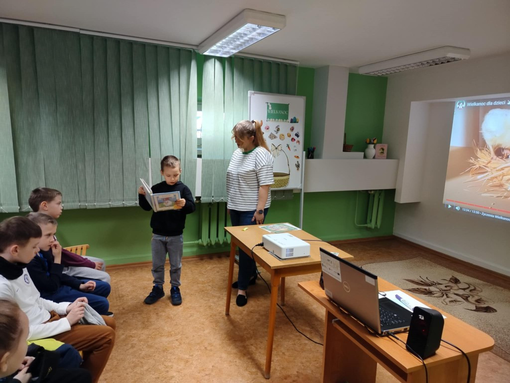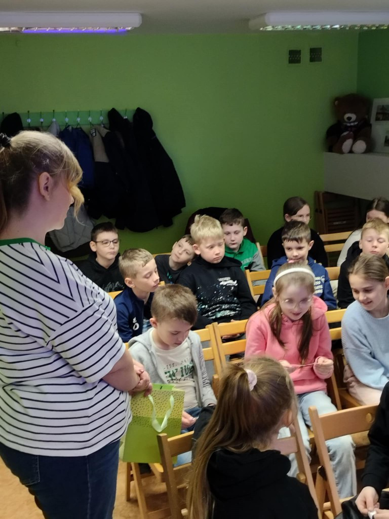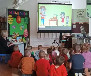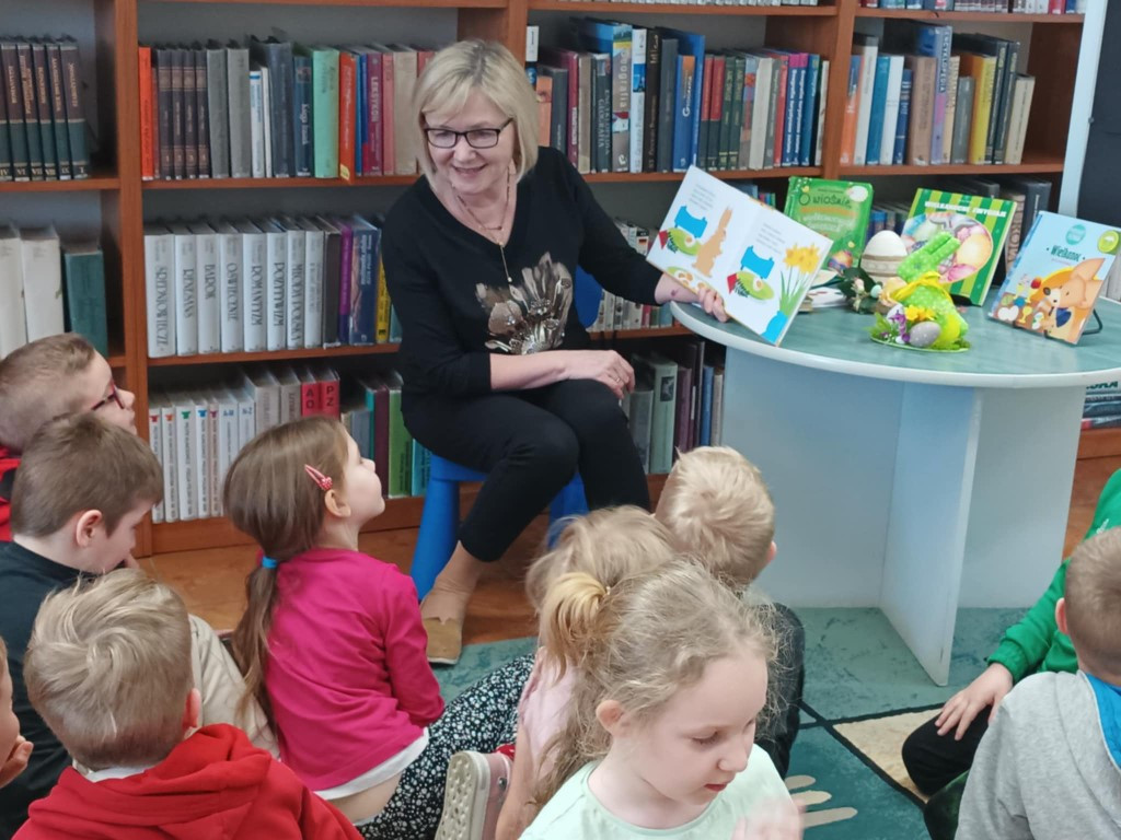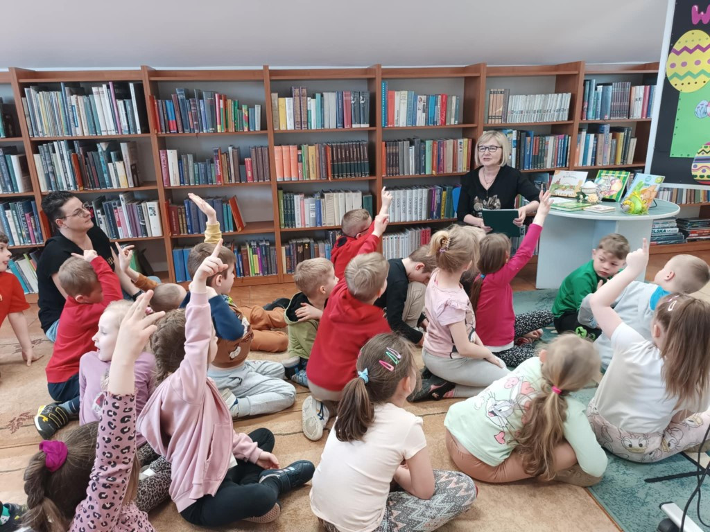 Dzisiaj naszą bibliotekę odwiedziła klasa II B ze Szkoły Podstawowej nr 4. Podczas zajęć dzieci miały okazję poznać tradycje związane z przygotowaniem koszyczka wielkanocnego. Dowiedziały się, jakie produkty powinny się w nim znaleźć, a także jakie mają one symboliczne znaczenie. Uczniowie losowali także pytania a za prawidłową odpowiedź dostawali słodką niespodziankę od Wielkanocnego Zajączka.
