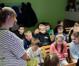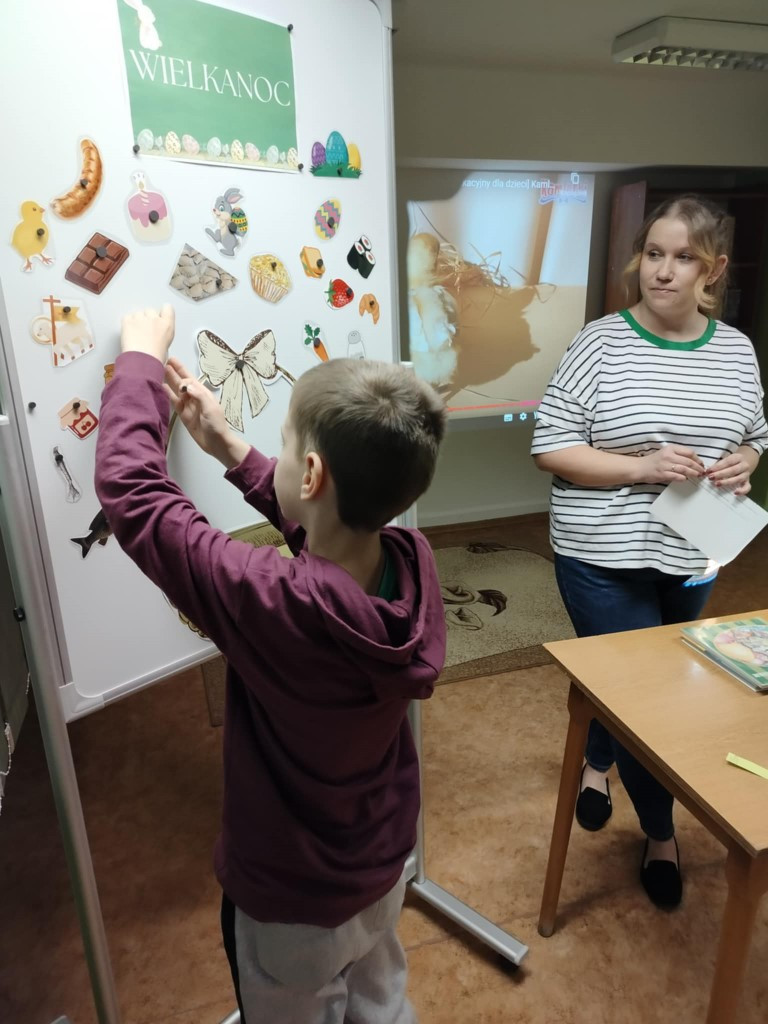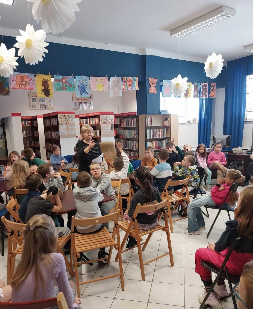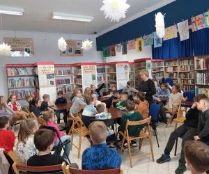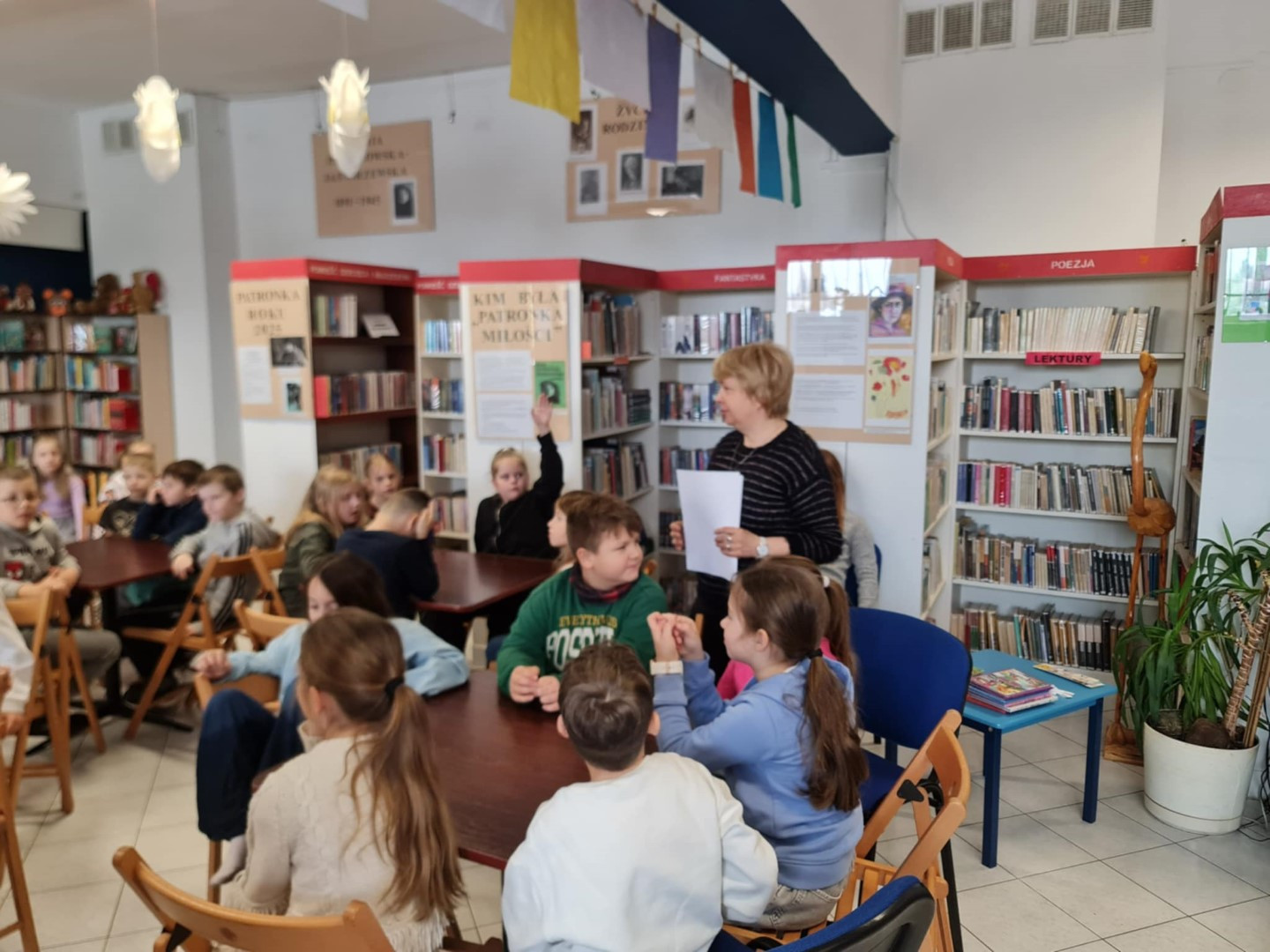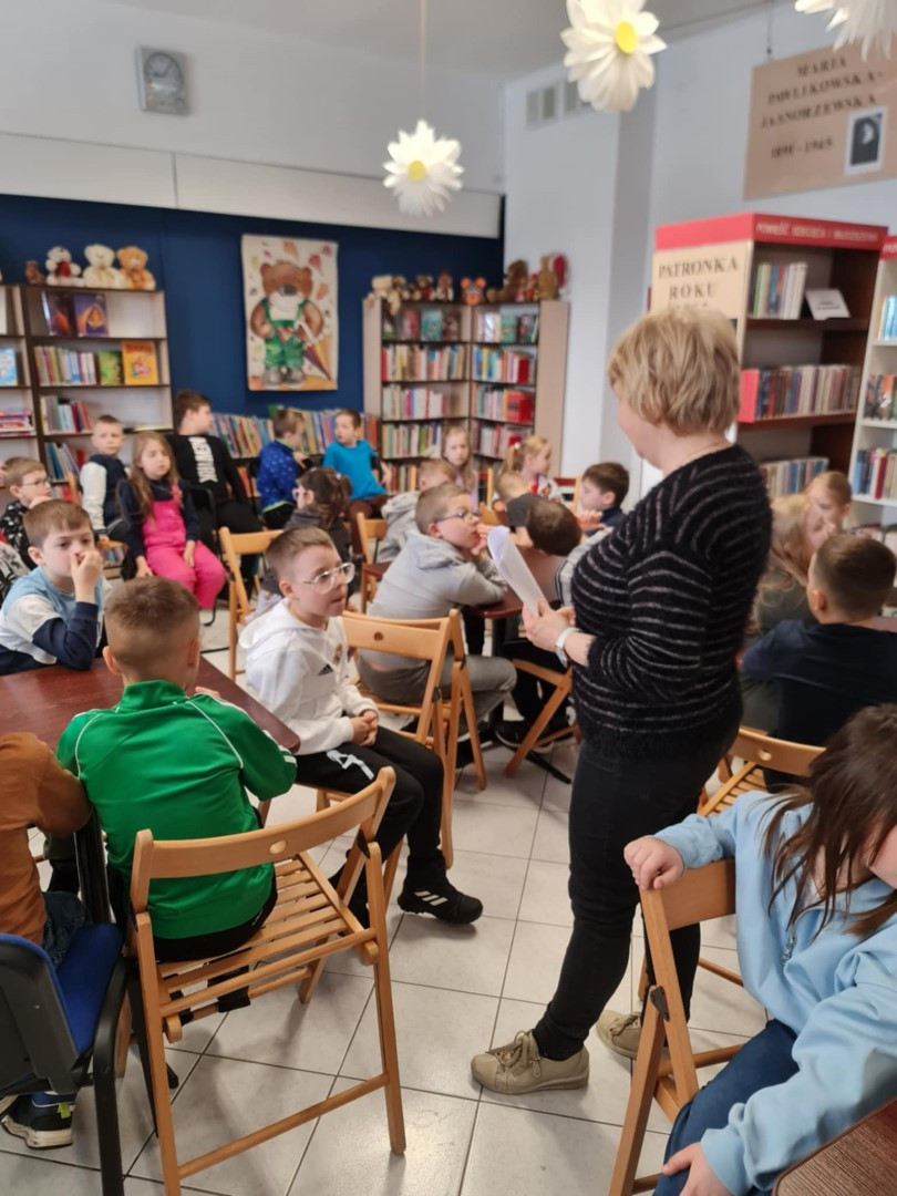 Dzisiaj naszą bibliotekę odwiedziła klasa II B ze Szkoły Podstawowej nr 4. Podczas zajęć dzieci miały okazję poznać tradycje związane z przygotowaniem koszyczka wielkanocnego. Dowiedziały się, jakie produkty powinny się w nim znaleźć, a także jakie mają one symboliczne znaczenie. Uczniowie losowali także pytania a za prawidłową odpowiedź dostawali słodką niespodziankę od Wielkanocnego Zajączka.