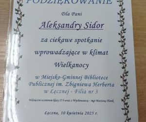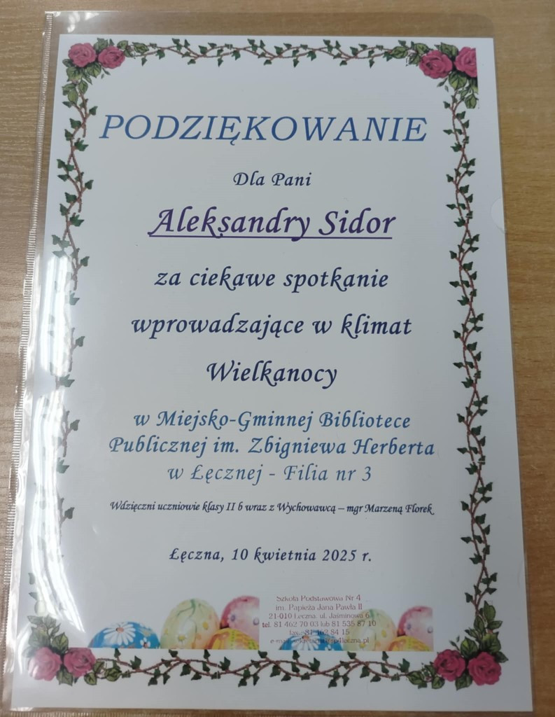 14 kwietnia 2025 r. Filię nr 3 odwiedziła klasa I D ze Szkoły Podstawowej nr 4 w Łęcznej, aby wziąć udział w zajęciach o tematyce Wielkanocnej. W trakcie spotkania dzieci poznały tradycje związane z przygotowaniem koszyczka wielkanocnego, dowiedziały się, jakie produkty powinny się w nim znaleźć, a także jakie mają one symboliczne znaczenie. Uczniowie wykonali także piękne pisanki które od dzisiaj są ozdobą naszej biblioteki.