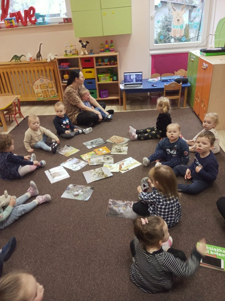 Przedszkolaki wysłuchały książeczki autorstwa Wiesława Drabika pt. Dzień kota”,z której poznały historię bezdomnego rudego kotka.