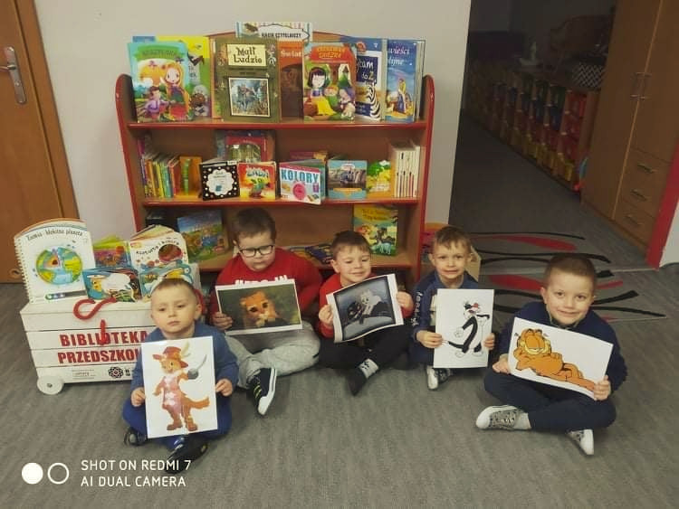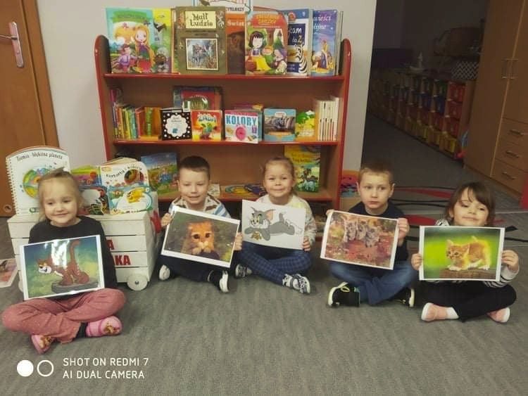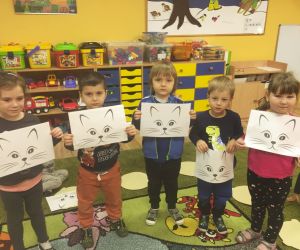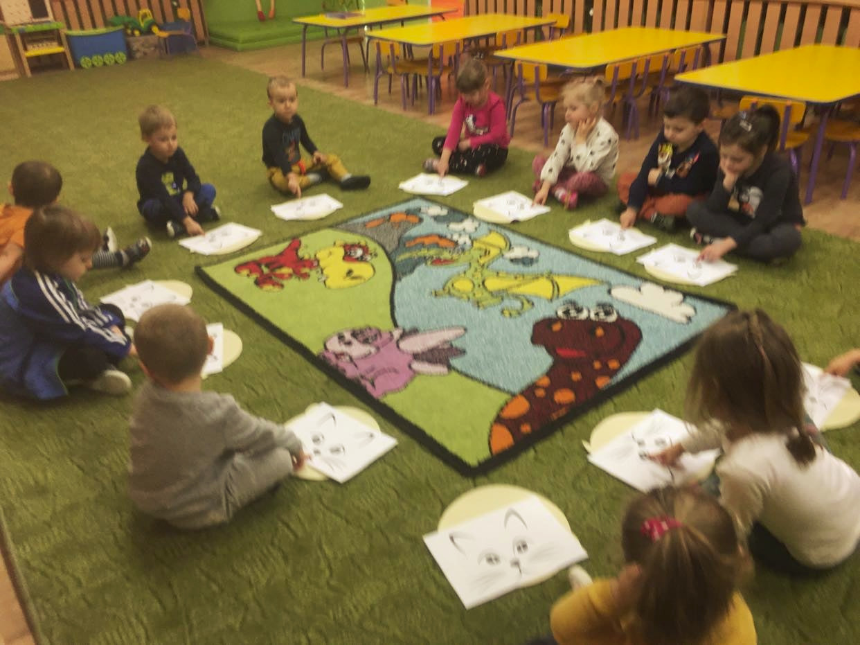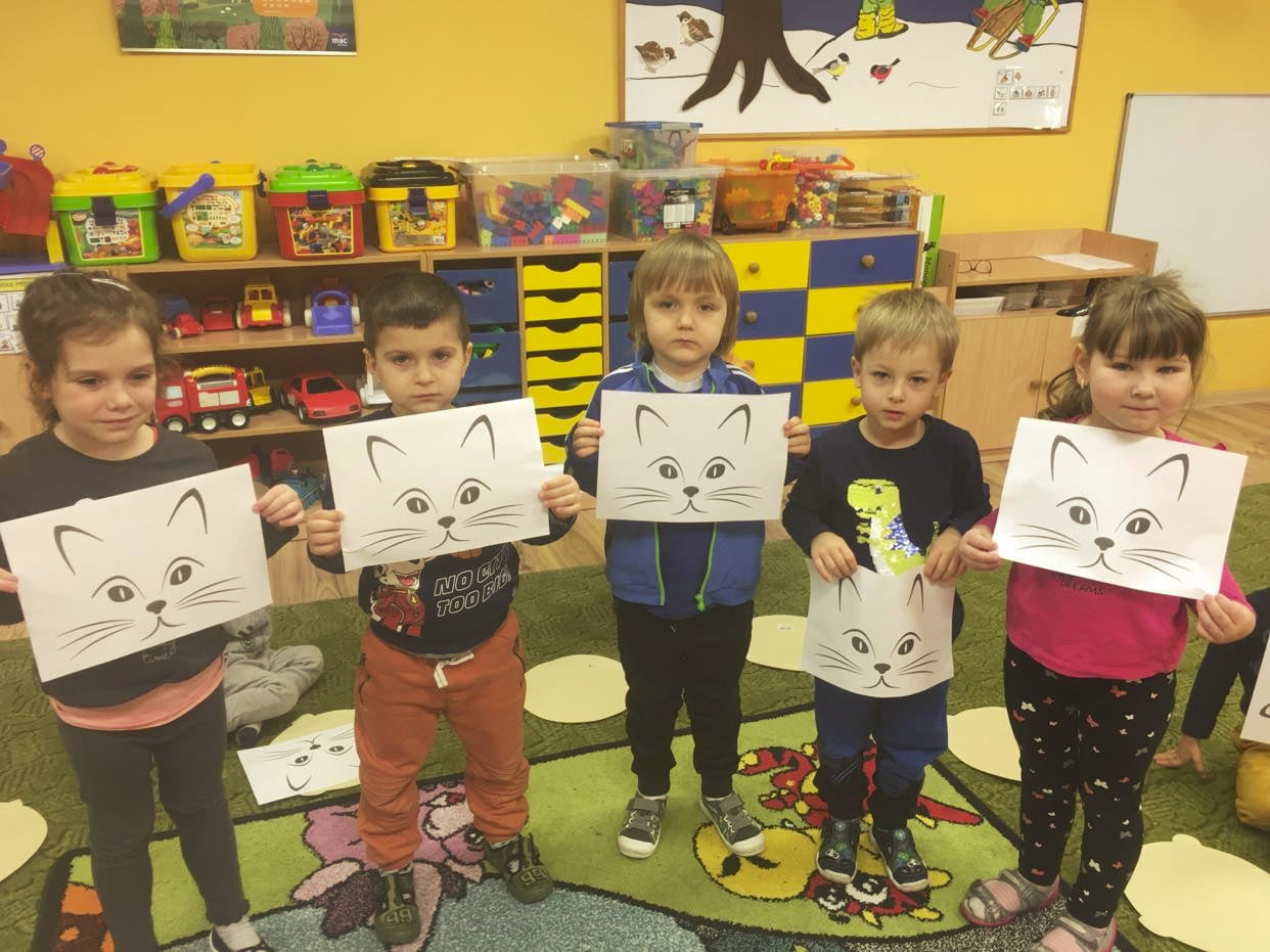 Wybór książki na lutowe czytanie nie był przypadkowy, ponieważ w tym miesiącu obchodzimy święto kotów - najbardziej popularnych zwierząt domowych. Ze względu na panującą pandemię, bibliotekarka nagrała czytanie, które zostało odtworzone w grupach przedszkolaków. Dzieci uważnie słuchały opowiadania, co widać na zamieszczonych zdjęciach, a następnie wykonywały prace plastyczne.