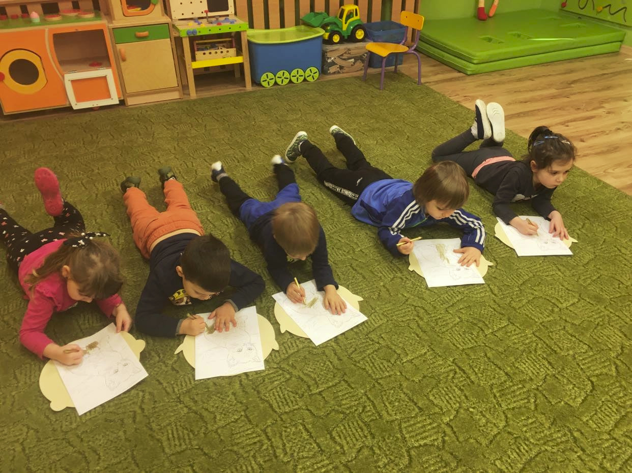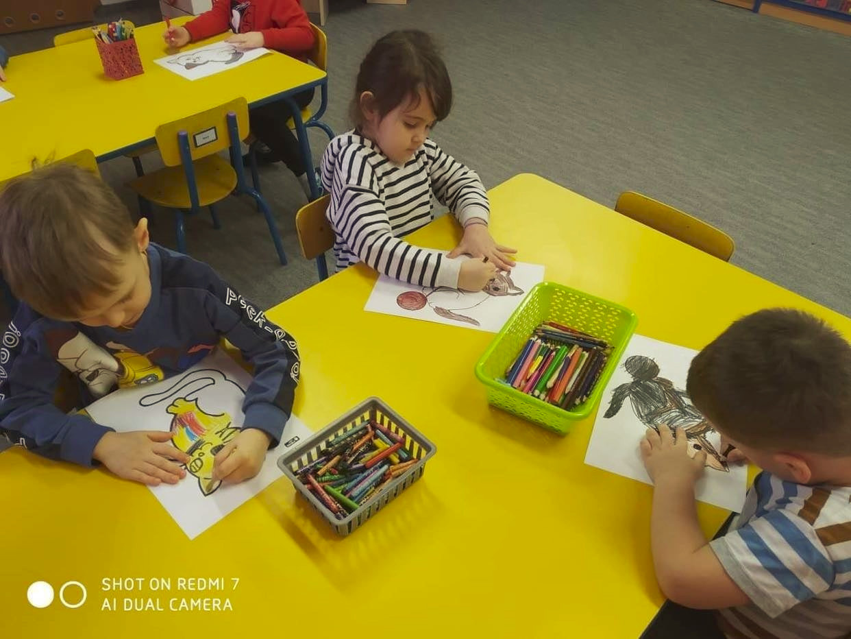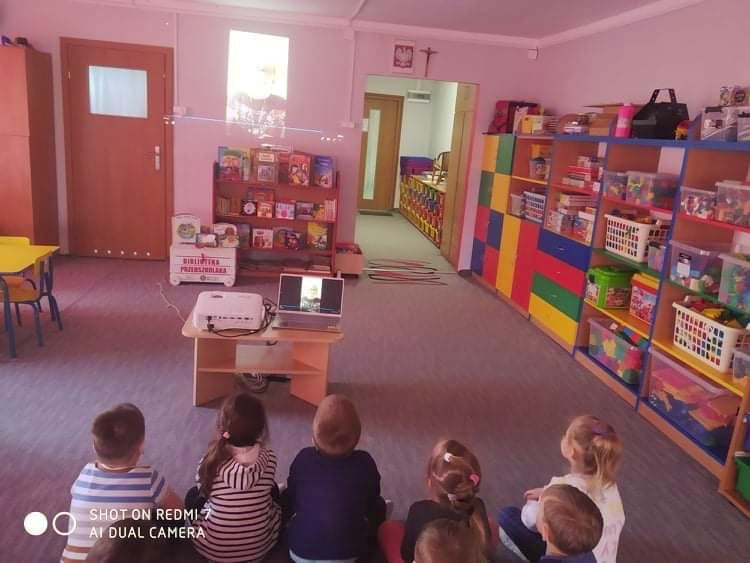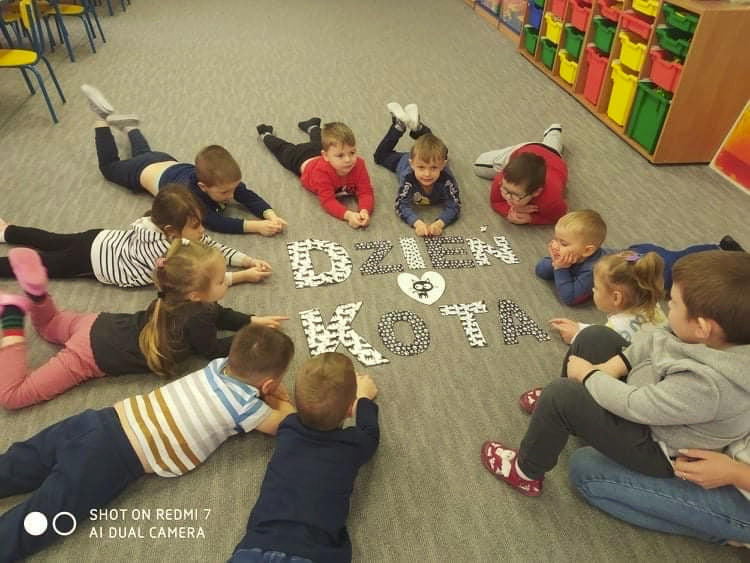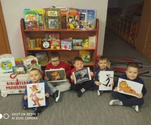 Wybór książki na lutowe czytanie nie był przypadkowy, ponieważ w tym miesiącu obchodzimy święto kotów - najbardziej popularnych zwierząt domowych. Ze względu na panującą pandemię, bibliotekarka nagrała czytanie, które zostało odtworzone w grupach przedszkolaków. Dzieci uważnie słuchały opowiadania, co widać na zamieszczonych zdjęciach, a następnie wykonywały prace plastyczne.