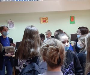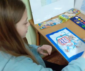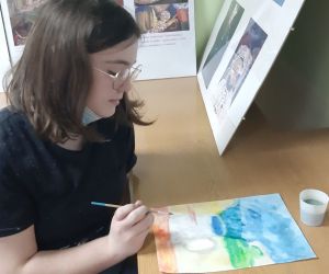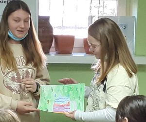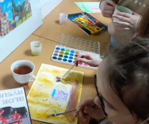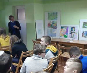 Następnie uczniowie zwiedzili autorską wystawę Majki Marii Zuzańskiej i wysłuchali jej ciekawego wykładu o malowaniu akwarelą. Malarka poprowadziła również dla nich warsztaty, na których uczniowie malowali prace w oparciu o różnorodne skojarzenia dla tego samego tematu, jakim był kubek z wiersza Konopnickiej. W ramach integracji i współpracy każda praca była malowana przez 4 osobowe grupy. W efekcie wspólnych działań powstało 6 prac malowanych akwarelą pt.: „Kubek”.