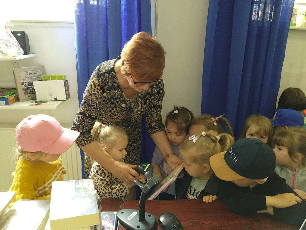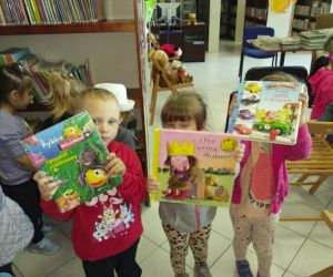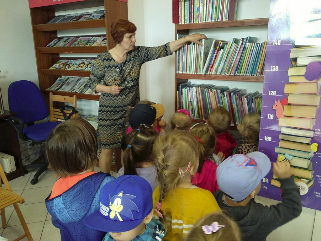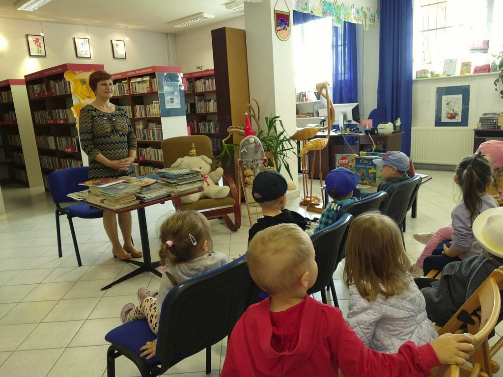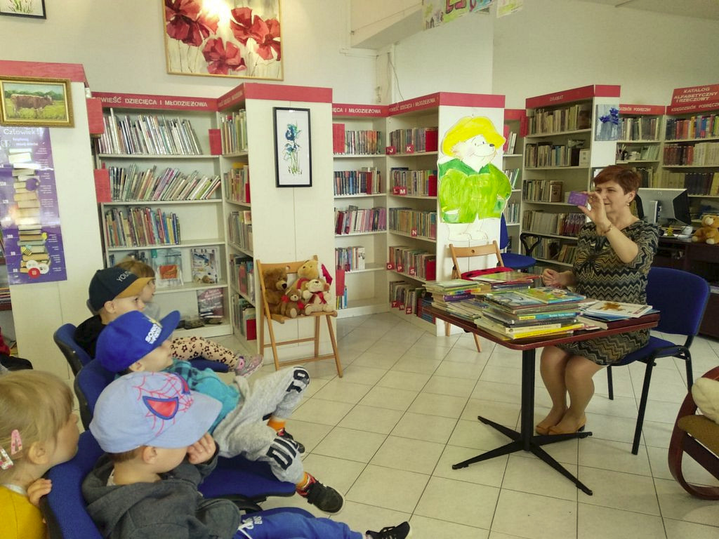 Bibliotekarka Krystyna Skoczylas przeczytała książkę Anity Głowińskiej pt.: „Kicia Kocia w bibliotece”. Dzieci dowiedziały się z niej co można robić w bibliotece poza wypożyczaniem książek, kim jest tajemnicza pani w kapeluszu i co to jest autograf. Z zainteresowaniem oglądały książki znajdujące się na półkach w dziale dla najmłodszych czytelników. Z okazji roku Marii Konopnickiej wysłuchały wiersza pt. : „Kukułeczka”, a następnie zobaczyły i doświadczyły jak wypożycza się książki. Na zakończenie miłej wizyty poczęstowały się cukierkami, a bibliotekarka otrzymała piękną laurkę z życzeniami z okazji Dnia Bibliotekarza i Bibliotek.