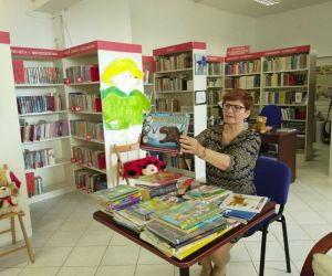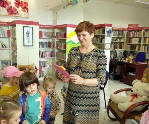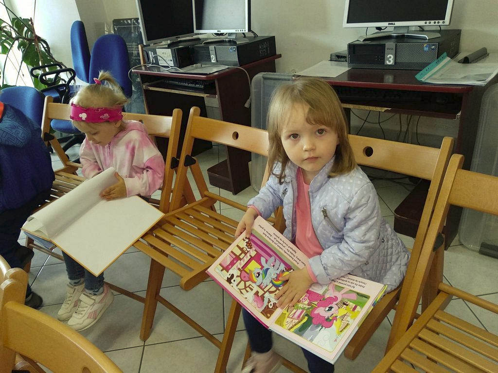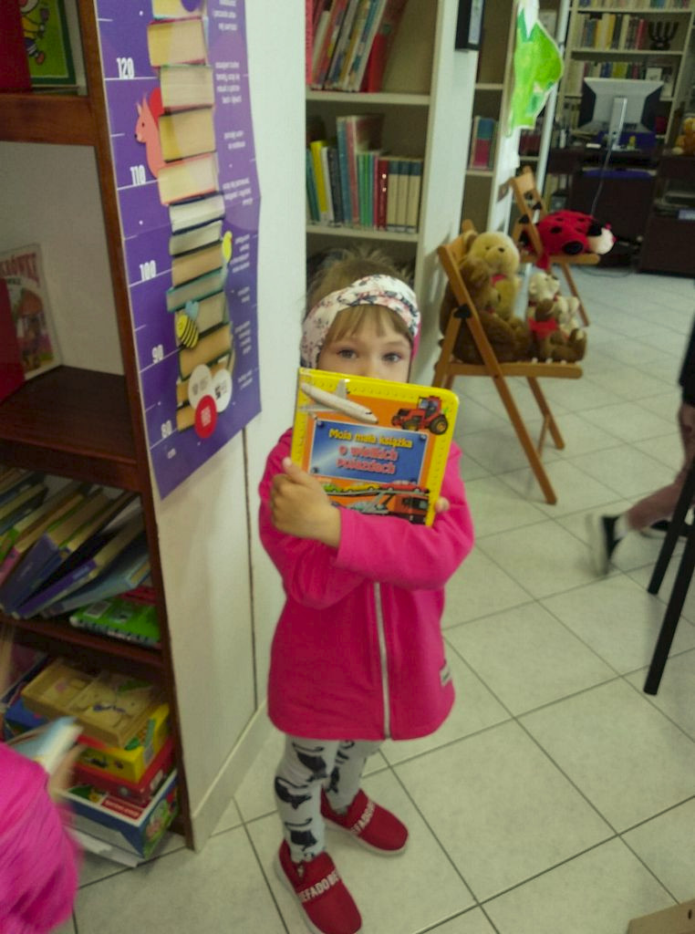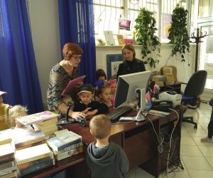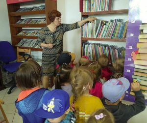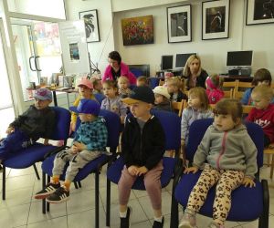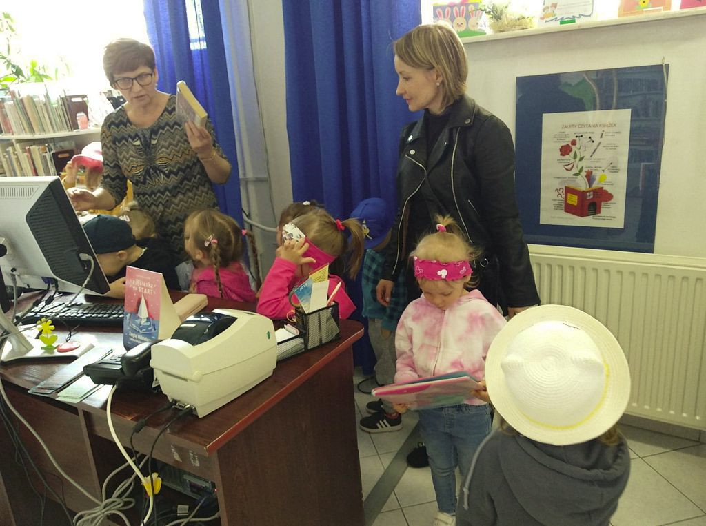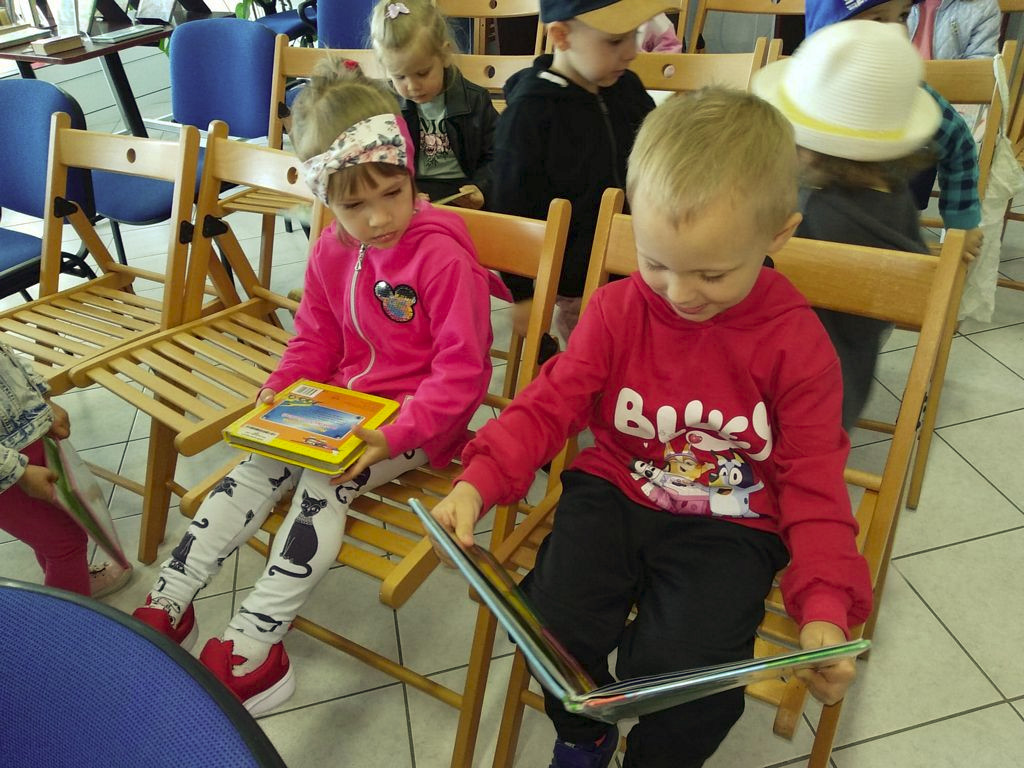 Bibliotekarka Krystyna Skoczylas przeczytała książkę Anity Głowińskiej pt.: „Kicia Kocia w bibliotece”. Dzieci dowiedziały się z niej co można robić w bibliotece poza wypożyczaniem książek, kim jest tajemnicza pani w kapeluszu i co to jest autograf. Z zainteresowaniem oglądały książki znajdujące się na półkach w dziale dla najmłodszych czytelników. Z okazji roku Marii Konopnickiej wysłuchały wiersza pt. : „Kukułeczka”, a następnie zobaczyły i doświadczyły jak wypożycza się książki. Na zakończenie miłej wizyty poczęstowały się cukierkami, a bibliotekarka otrzymała piękną laurkę z życzeniami z okazji Dnia Bibliotekarza i Bibliotek.