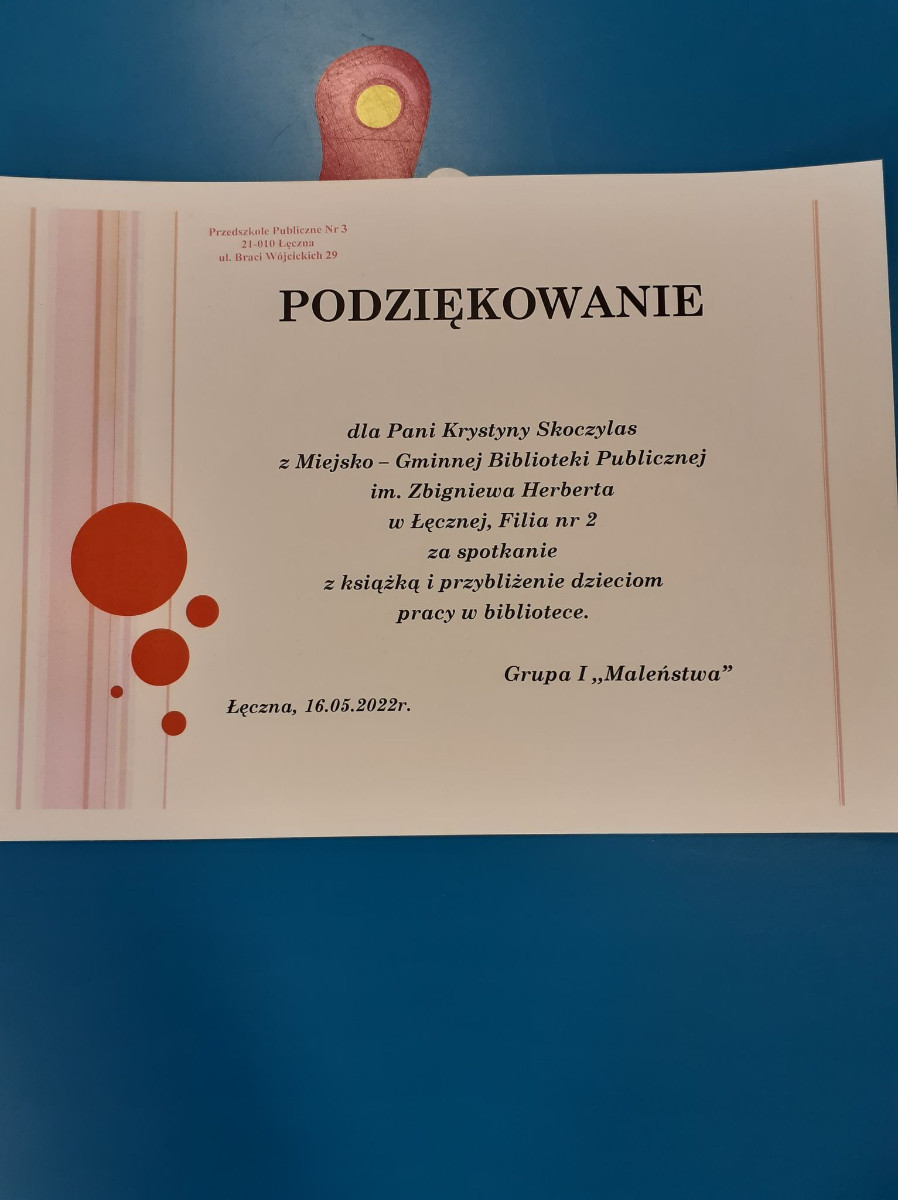 16 maja dzieci z grupy „Maleństwa” z Publicznego Przedszkola nr 3 w Łęcznej wraz z Paniami odwiedziły Bibliotekę przy ul. Obrońców Pokoju 1.