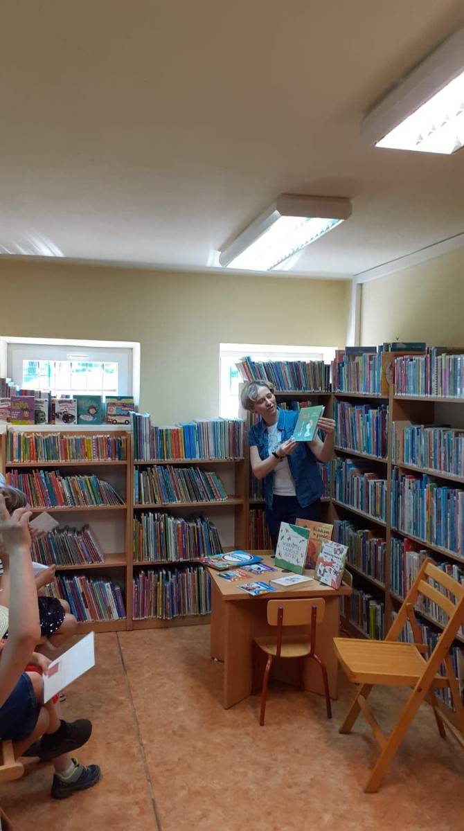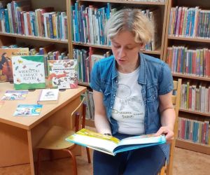 Prowadząca opowiedziała także uczestnikom o ciekawych lekturach na wakacje i zachęciła je do samodzielnego czytania. Następnie pokazała małym czytelnikom ciekawe książeczki i książki o różnej wielkości, tematyce i kształtach, aby każdy mógł znaleźć coś dla siebie.
