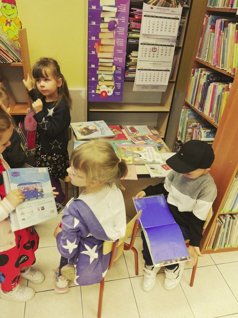 Aby przybliżyć zasady korzystania z biblioteki, dzieci wysłuchały książeczki z serii przygody Fenka pt. Biblioteka. Było też samodzielne zapoznanie się z naszym księgozbiorem i oglądanie książeczek o misiach i innych bohaterach.