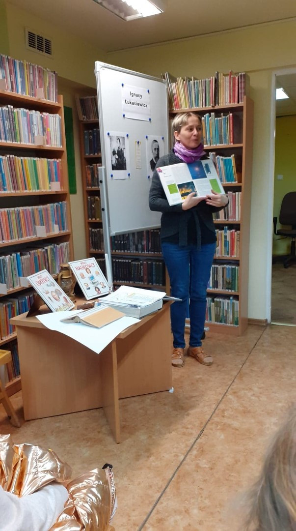 Nasi goście wysłuchali również fragmentu książki J. Sikory pt.: „Ignacy Łukasiewicz”, mówiącego o odkryciu nafty i o tym jak I. Łukasiewicz „zlecił mistrzowi Bratkowskiemu sporządzenie lamp olejnych do oświetlenia lwowskich ulic”.