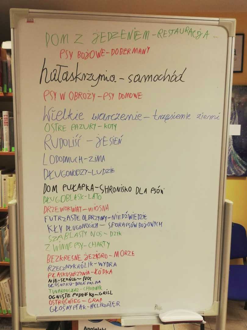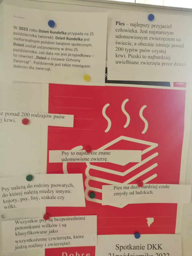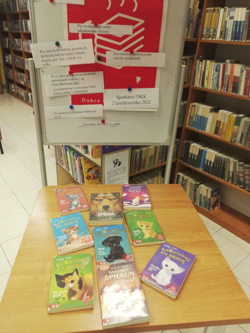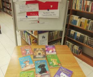 Podczas ostatniego spotkania DKK dla dzieci i młodzieży, które odbyło się w Filii nr 1 na ul. Górniczej 12 włączyliśmy się do obchodów Międzynarodowego Dnia Kundelka, który wypada 25 października. Stąd tematyka omawianej książki, a była nią „Sfora” Erin Hunter – znanej już naszym klubowiczom autorki cyklu „Wojownicy”. Na podstawie wybranej lektury stworzyliśmy z klubowiczami słownik zwrotów i pojęć, które autorka zawarła w tej fascynującej powieści. Pozwoliło nam to spojrzeć na nasz świat psim wzrokiem a jednocześnie lepiej wczuć się w przeżycia bohaterów. Jako, że październik jest też miesiącem ochrony zwierząt wspominaliśmy również przeczytane wcześniej przez uczestników klubu książki Holly Webb z serii” Zaopiekuj się mną”, które posiadamy w naszej bibliotece i serdecznie polecamy wszystkim miłośnikom zwierząt i nie tylko.