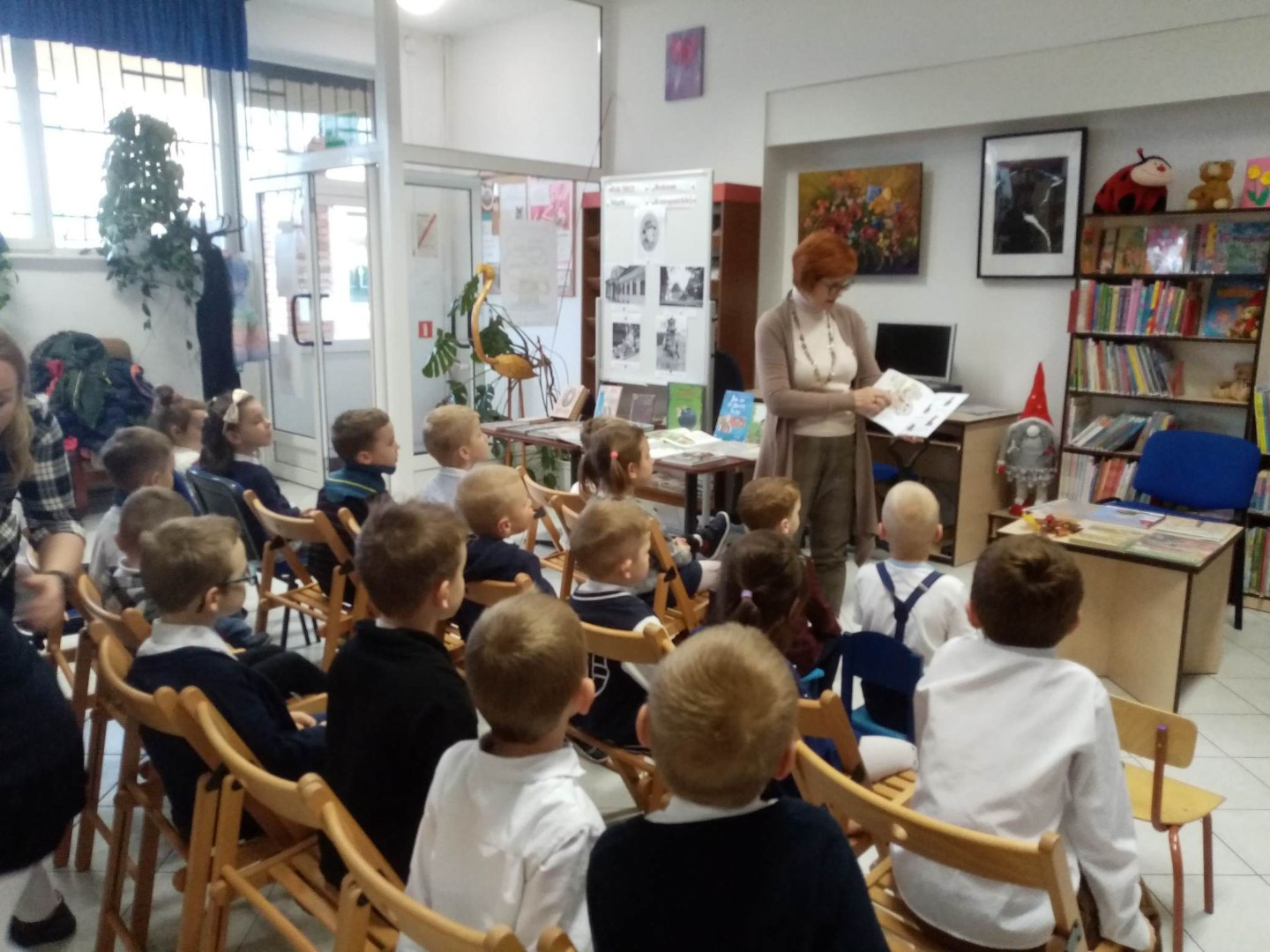 Bibliotekarka, Krystyna Skoczylas, przeczytała dzieciom książkę Margaret i H.A. Rey pt.