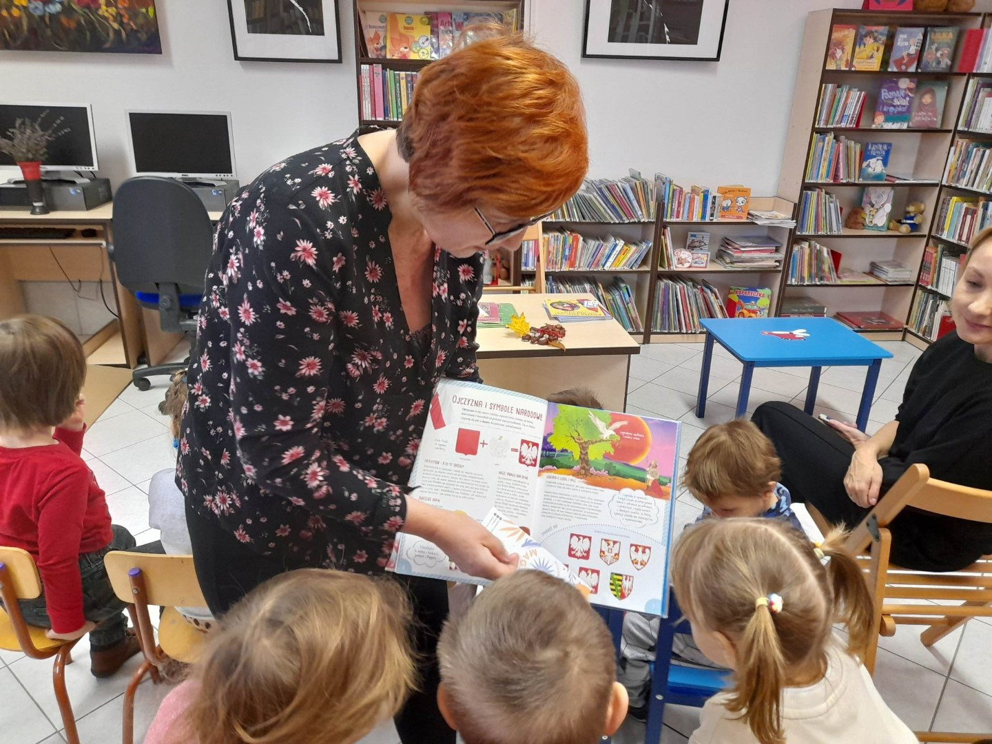 Krystyna Skoczylas objaśniła dzieciom, czym jest ojczyzna, jakie są nasze symbole narodowe oraz znaczenie barw. Przedszkolaki dowiedziały się także czym jest hymn i jaką należy przyjąć postawę podczas jego śpiewania. Wszystkie te informacje pochodzą z książki Janusza Puskarza pt. : „ABC małego patrioty”.