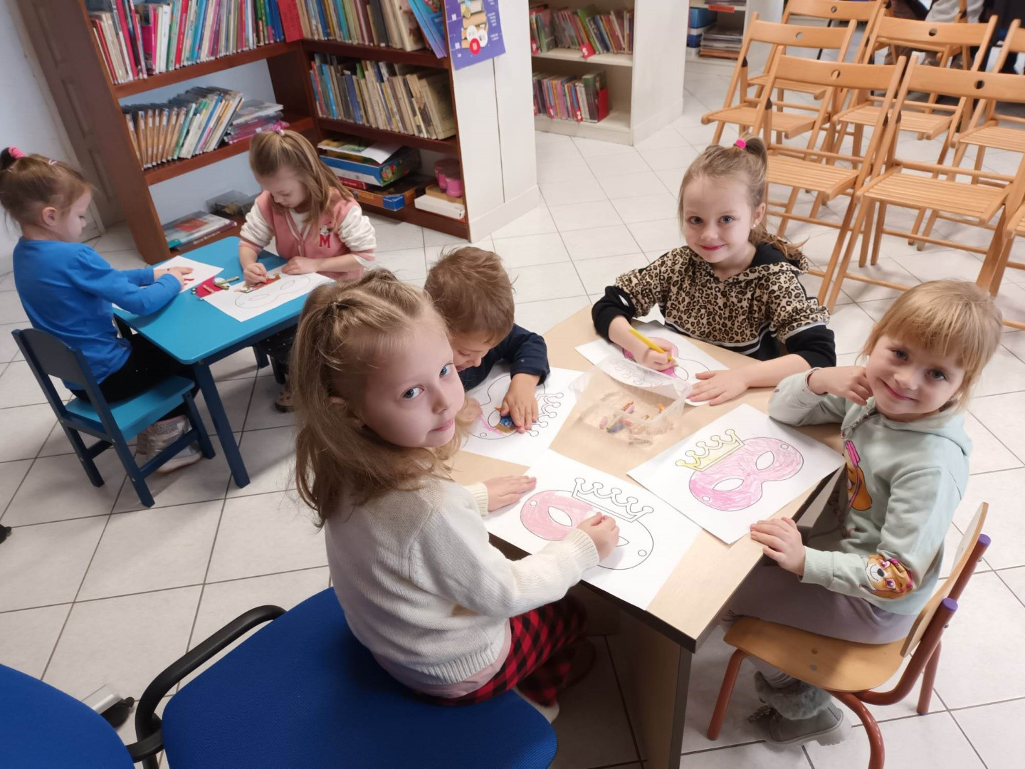 „Misie” wysłuchały też wiersza M. Terlikowskiej, pt. " Bal baloników”. Podczas karnawałowego spotkania, przy akompaniamencie muzyki karnawałowej, przedszkolaki pomalowały przygotowane maski karnawałowe. Po wykonaniu prac plastycznych zrobiliśmy wspólne, pamiątkowe zdjęcie.