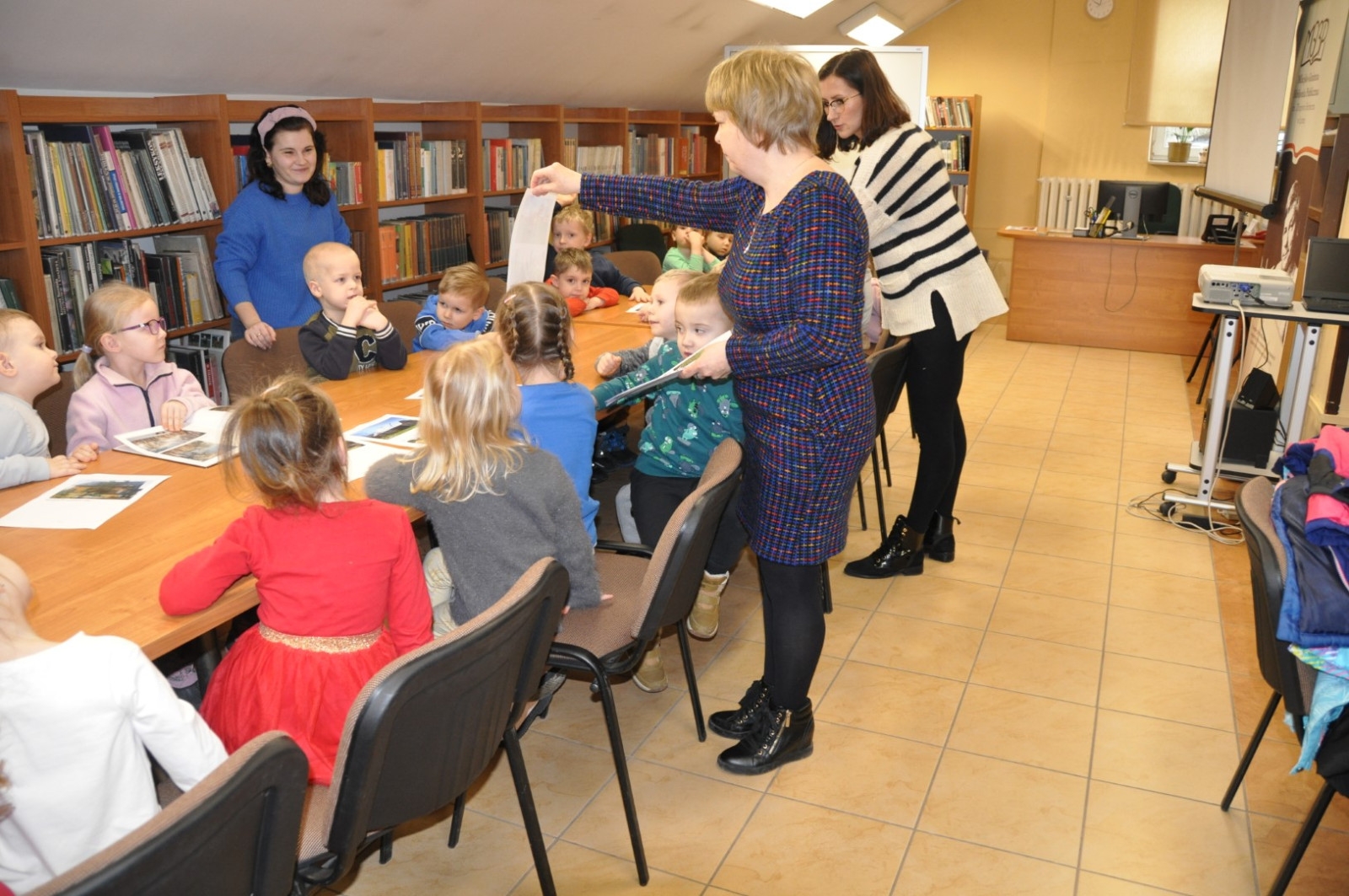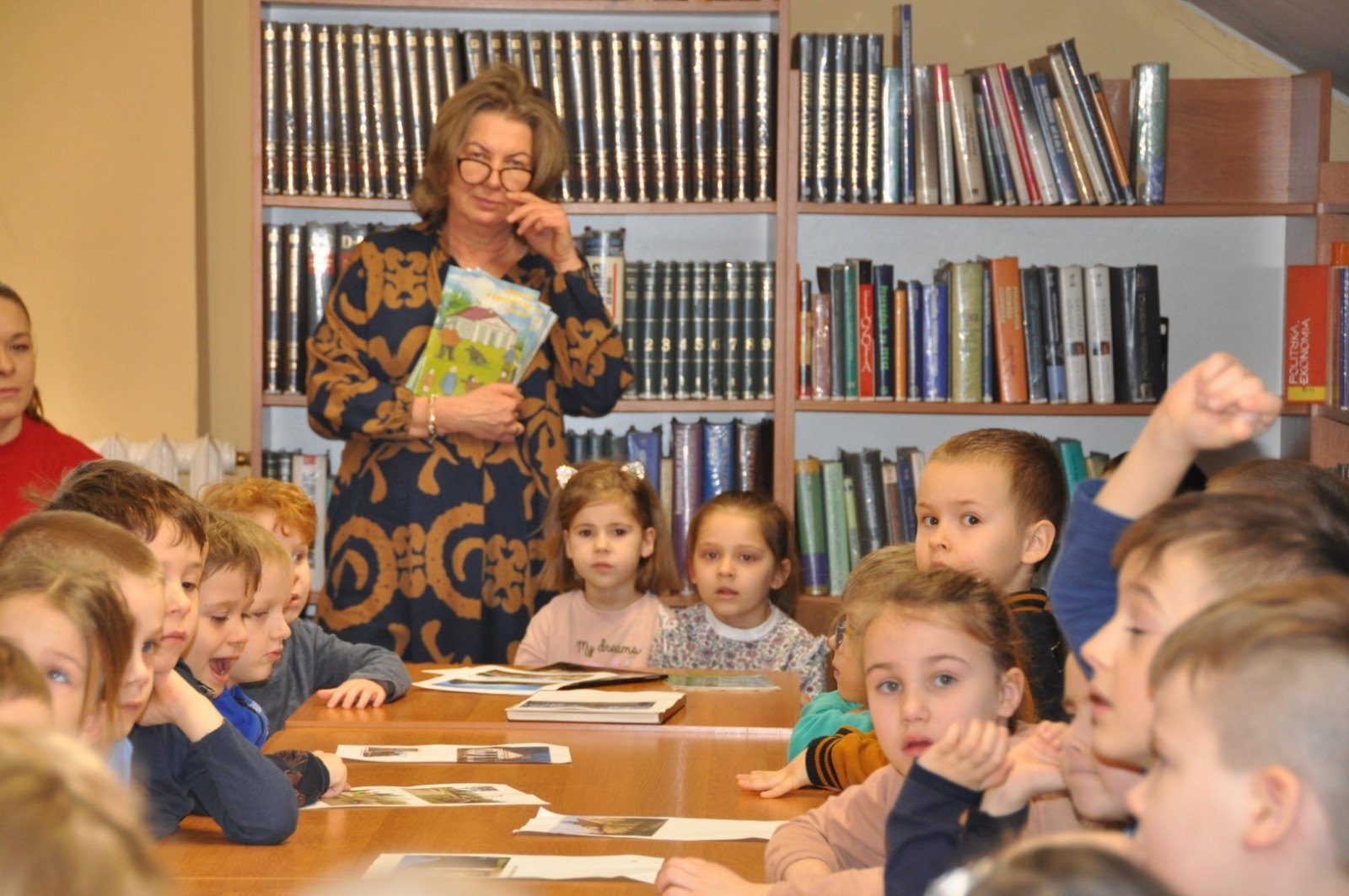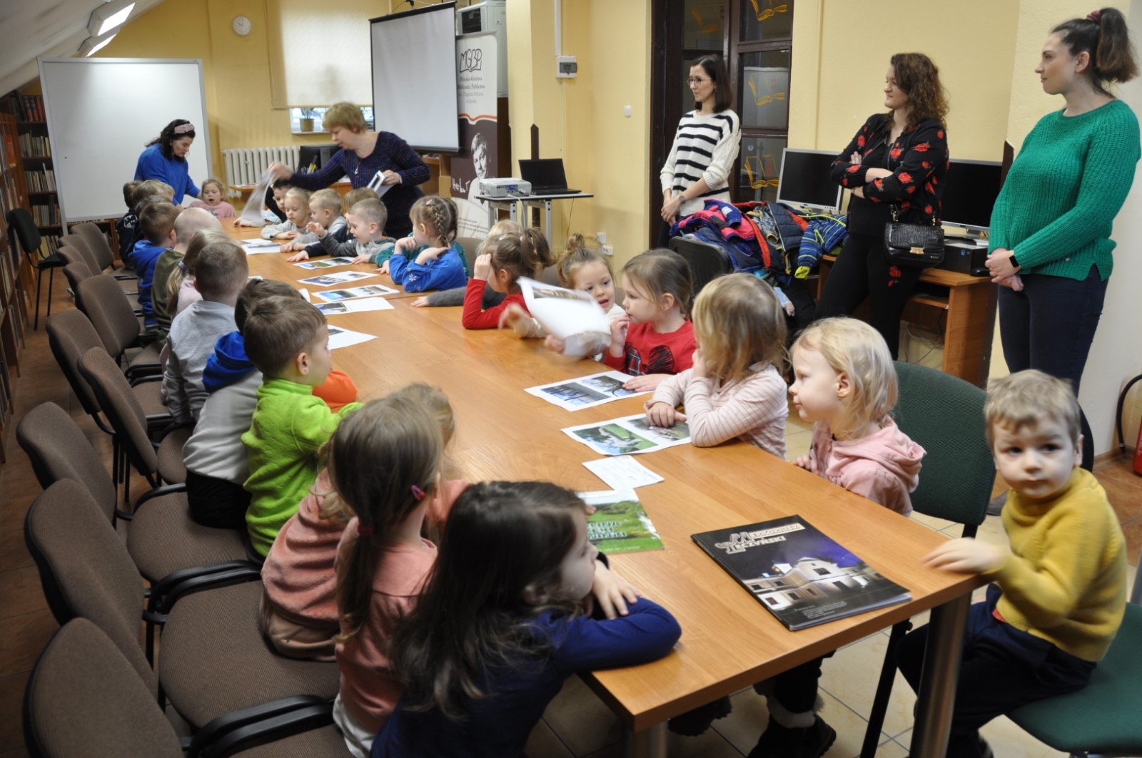 Prowadząca spotkanie opowiedziała przedszkolakom jak dawniej wyglądała Łęczna. Dzieci obejrzały fotografie, na których zamieszczone były stare budynki, domy mieszkalne, a także zabytki, które warto zobaczyć. Dowiedziały się też o Dolinie Dinozaurów, którą można odwiedzić, wybierając się na spacer z rodziną. Wysłuchały „Legendy o łęczyńskim herbie” autorstwa Wojciecha Próchniewicza. Przedszkolaki żywo reagowały oglądając zdjęcia, zadawały pytania i zadziwiały swoją spostrzegawczością i bystrością.
