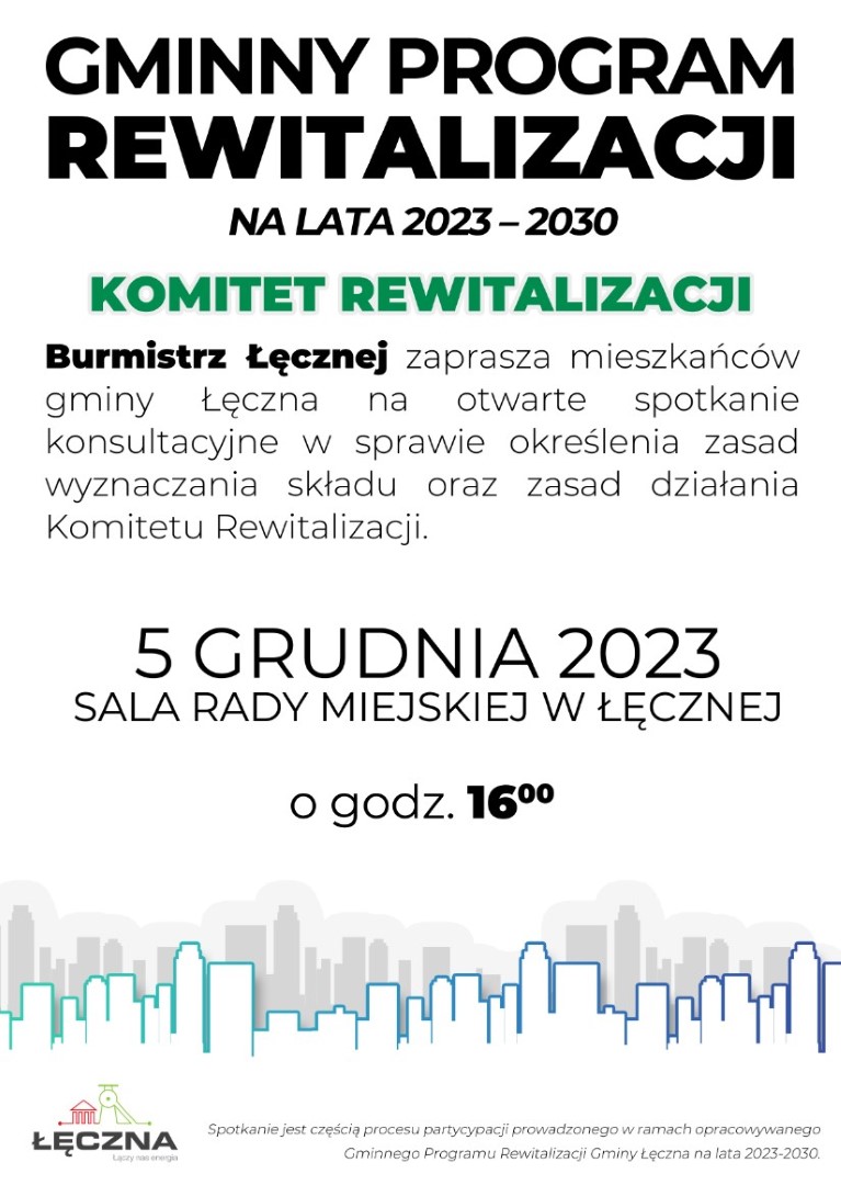Burmistrz Łęcznej zaprasza mieszkańców gminy Łęczna na otwarte spotkanie konsultacyjne w sprawie określenia zasad wyznaczania składu oraz zasad działania Komitetu Rewitalizacji Spotkanie odbędzie się 5 grudnia 2023 r. o godzinie 16:00 w siedzibie Rady Miejskiej w Łęcznej, Plac Kościuszki 22