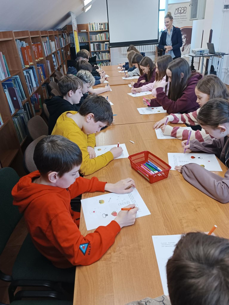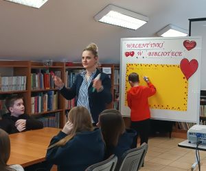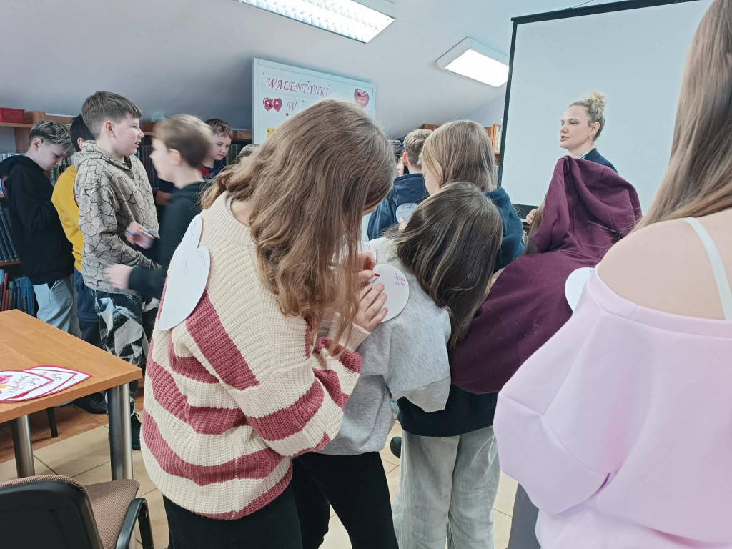 14 lutego świętujemy Walentynki – dzień miłości, radości, życzliwości i przyjaźni. Z tej okazji Bibliotekę przy ul. Bożnicznej odwiedziła klasa 5 F ze Szkoły Podstawowej nr 2 w Łęcznej wraz z wychoPodczas zajęć uczniowie wyszukiwali słowa kojarzące się z Walentynkami, którymi następnie uzupełnili tablicę tematyczną. Poznali również historię tego święta, obejrzeli film o patronie zakochanych – świętym Walentym, a także zmierzyli się z walentynkowymi quizami. Nie zabrakło wróżb oraz kreatywnej zabawy w tworzenie nietypowych kartek – uczestnicy pisali sobie miłe słowa na kartkach przypiętych do pleców. Na zakończenie spotkania każdy otrzymał słodki upominek – lizak w kształcie serca.