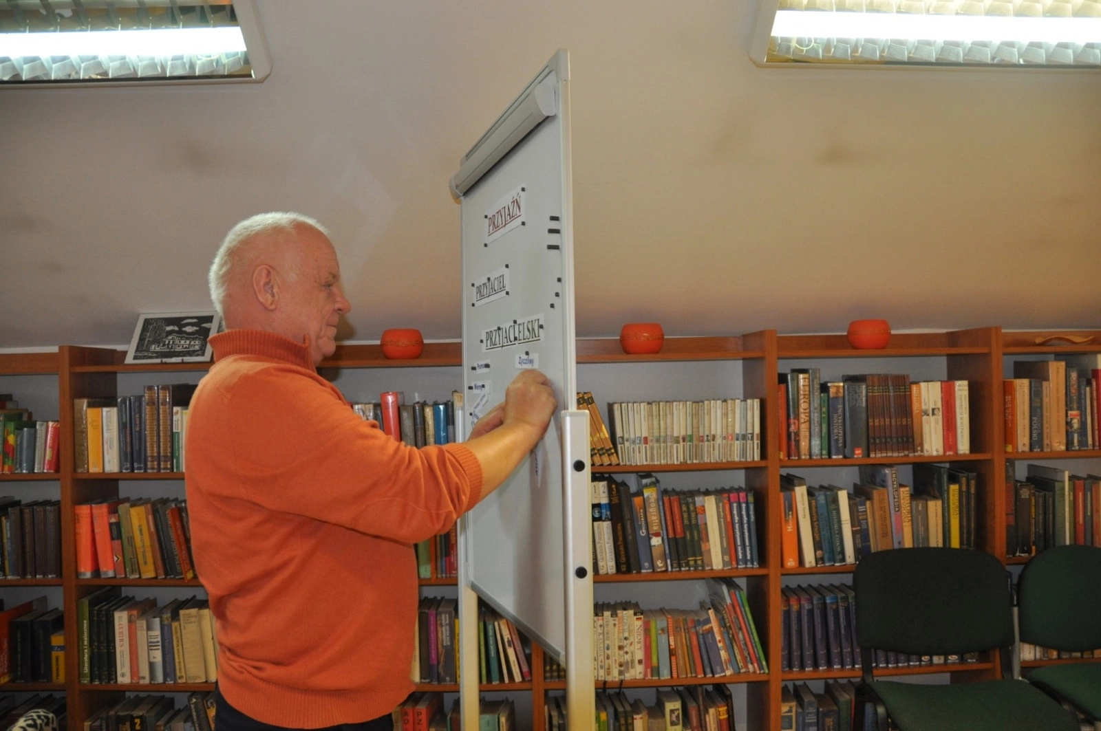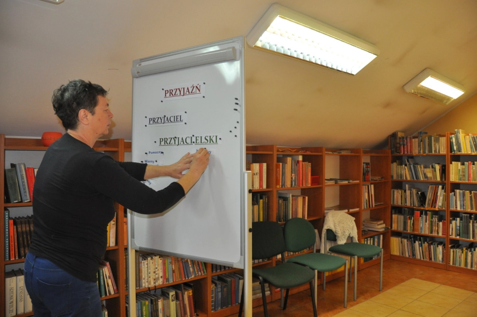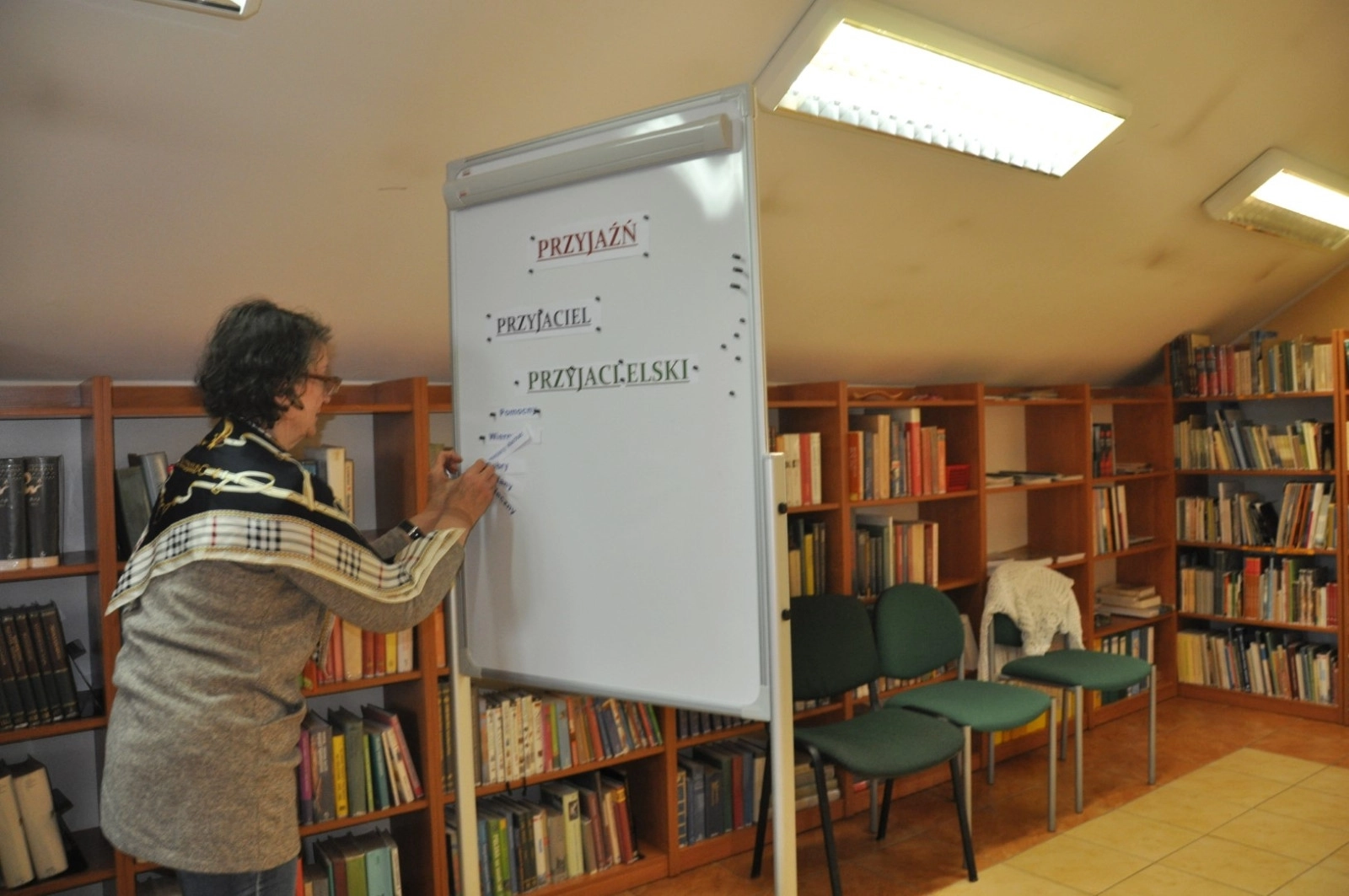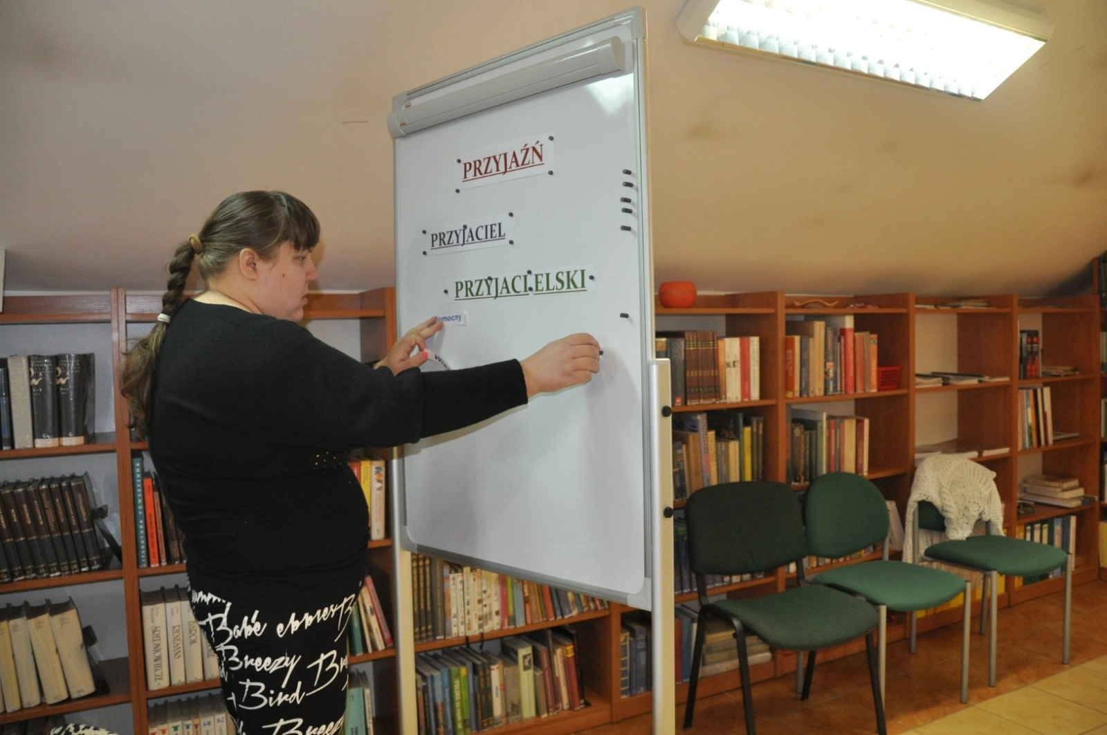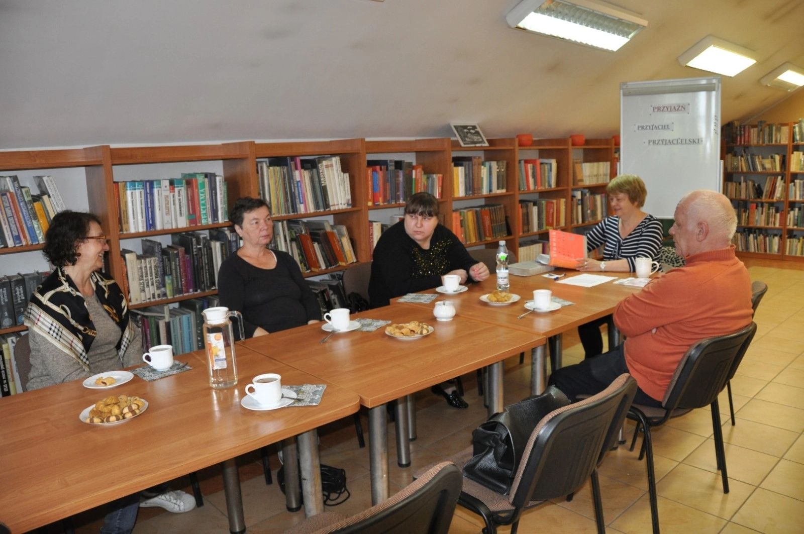 W dniu 29 września w Bibliotece Głównej odbyły się zajęcia z biblioterapii dla uczestników Środowiskowego Domu Samopomocy w Łęcznej. Na spotkaniu rozmawiano o przyjaźni, o tym jakie cechy powinien mieć dobry przyjaciel, z kim możemy się zaprzyjaźnić i czy trudno być przyjacielem. W trakcie zajęć uczestnicy brali udział w pracach w grupach, a także w zabawie słownej i ruchowej.
