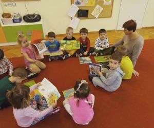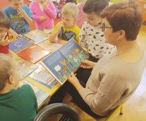 Spotkanie odbyło się w ramach akcji „Koszyk z książkami”. Po wysłuchaniu opowieści dzieci samodzielnie wybrały sobie i wypożyczyły książki do przeczytania w domu.