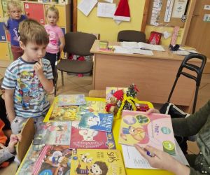 12 grudnia bibliotekarka z Filii nr 2 po raz pierwszy spotkała się z dziećmi z grupy „Wiewiórki” w Przedszkolu nr 4 w Łęcznej na głośnym czytaniu. Jako, że Mikołajki były niedawno, a Święta Bożego Narodzenia blisko dzieci wysłuchały opowiadania Wiesława Drabika pt.: „Wielka zadyma z Mikołajem”. Gdy w ciepłym domu Agatka spogląda przez okno z komina wypadł Mikołaj i bezdomny kot. Agatka miała szczęście, że mogła wybrać sobie prezent. Jaki? Dzieci dowiedziały po wysłuchaniu tej zabawnej historii. Morał z tej opowieści jest taki, że potrzebujemy siebie nawzajem! Bibliotekarka przyniosła do Przedszkola małą choinkę, ozdoby choinkowe i opowiadała o Wigilii, o ozdobach choinkowych i prezentach. Dzieci opowiadały o ubieraniu choinki i pieczeniu pierniczków, odgadywały zagadki związane z zimą. Było to pierwsze spotkanie w ramach akcji „Koszyk z książkami”, dzieci samodzielnie wybrały sobie książki i wypożyczyły do domu. Każde dziecko otrzymało w prezencie zakładkę do książki i cukierka. Na zakończenie spotkania złożyliśmy sobie życzenia świąteczne.
