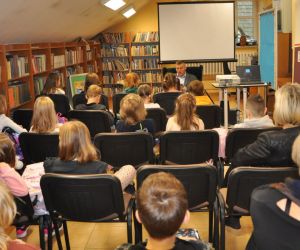 Pan Grzegorz z wielką przyjemnością przyjął zaproszenie na spotkanie i przeczytał dzieciom książkę pt. „Kiedy tata Oli był mały". Dzieci z ogromnym zainteresowaniem słuchały uroczej opowieści, w której tata Oli wraca wspomnieniami do czasów ze swojego dzieciństwa. Podczas czytania było dużo śmiechu, bo jak nie śmiać się słuchając: - "Kiedy ja byłem mały, kładliśmy się spać godzinę po powrocie ze szkoły", albo - "Ach, bo kolacja była tylko w środy. W pozostałe dni nic nie jedliśmy".