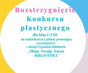 15 maja 2023 r. Filia nr 3 rozstrzygnęła konkurs z okazji Tygodnia Bibliotek pod hasłem „Moja, Twoja, Nasza - Biblioteka” na najlepszy plakat promujący czytanie książek wśród dzieci i młodzieży. W dniach 14.04.2023 r. - 12.05.2023 r. na konkurs wpłynęło 29 prac uczniów ze szkół podstawowych miasta i gminy Łęczna. Komisja konkursowa kierując się zgodnością tematyczną z hasłem, regulaminem konkursu, pomysłowością przedstawienia tematu i samodzielnością prac wyłoniła następujących laureatów i wyróżnionych.