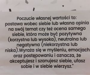 Podczas spotkania nasi goście usłyszeli bajkę dla dorosłych pt..: „W poszukiwaniu siebie” Agnieszki Kozak oraz fragment przypowieści ze wschodu z rozdziału „ Swoją siłę możesz czerpać z wolności” z książki pt.: „Kochaj siebie ! Idealnie doskonałe” Anny Dereszowskiej. Bibliotekarka opowiadała także słuchaczom o pięciu krokach: jak wzmocnić swoją samoocenę, myśleć i mówić o sobie dobrze, odkrywać swoje pasje, akceptować siebie, być odpowiedzialnym za siebie i budować swój pozytywny obraz. Jednym ze sposobów na akceptację samego siebie jest oddanie się swoim pasjom i zainteresowaniom dlatego podczas zabawy psychologicznej „Mój przyjaciel JA” każdy mógł napisać o swoich pomysłach i działaniach „ Co zrobię dzisiaj aby być szczęśliwym”? W trakcie dyskusji zostało ujawnionych wiele talentów i zalet uczestników oraz pomysłów na bycie szczęśliwym. Istotnym elementem zajęć było poszukiwanie motywacji do działania, odkrywanie swoich mocnych stron oraz stworzenie klimatu samoakceptacji.