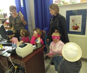 Bibliotekarka Krystyna Skoczylas przeczytała książkę Anity Głowińskiej pt.: „Kicia Kocia w bibliotece”. Dzieci dowiedziały się z niej co można robić w bibliotece poza wypożyczaniem książek, kim jest tajemnicza pani w kapeluszu i co to jest autograf. Z zainteresowaniem oglądały książki znajdujące się na półkach w dziale dla najmłodszych czytelników. Z okazji roku Marii Konopnickiej wysłuchały wiersza pt. : „Kukułeczka”, a następnie zobaczyły i doświadczyły jak wypożycza się książki. Na zakończenie miłej wizyty poczęstowały się cukierkami, a bibliotekarka otrzymała piękną laurkę z życzeniami z okazji Dnia Bibliotekarza i Bibliotek.
