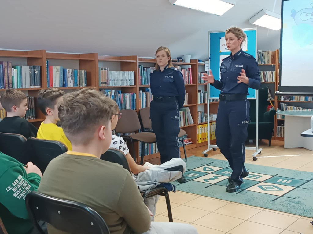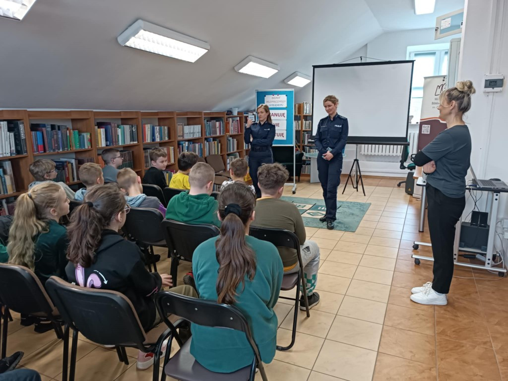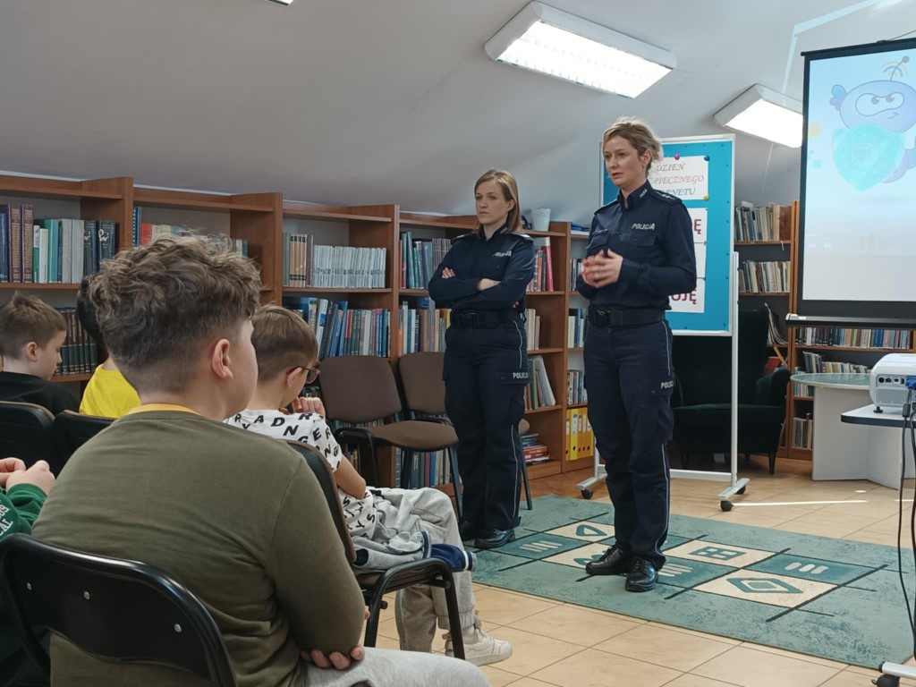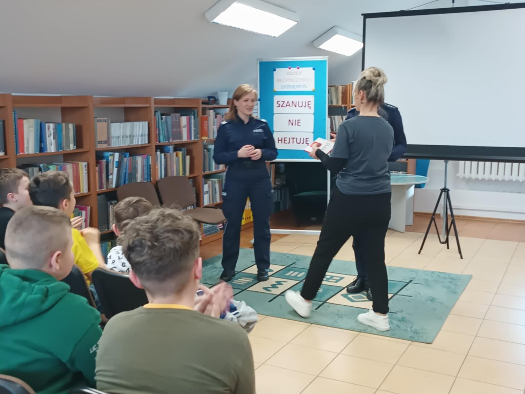 Następnie, policjantki omówiły z uczniami kwestie związane z zagrożeniami płynącymi z Internetu, wyjaśniając pojęcia związane z przemocą online oraz zwracając uwagę na zasady bezpiecznego korzystania z sieci.