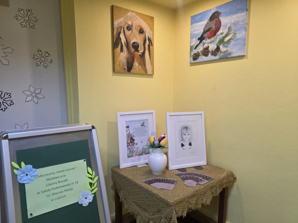 W piątek , 5 grudnia 2025 r., w Filii nr 3 Miejsko-Gminnej Biblioteki Publicznej im. Zbigniewa Herberta, przy ul. Jaśminowej 4 w Łęcznej odbył się wernisaż wystawy malarstwa młodej artystki Lilianny Buczek pt. „Odkrywamy młode talenty”. Lilianna Buczek ze Szkoły Podstawowej nr 18 im. Macieja Rataja w Lublinie, to utalentowana uczennica drugiej klasy. Lila ma 8 lat i od zawsze kocha zwierzęta, szczególnie psy, konie i ptaki – to one najczęściej pojawiają się w jej pracach. Lubi łączyć kolory i tworzyć różne faktury, odkrywając, jak z farb powstaje coś wyjątkowego. Malowanie ją wycisza. Prezentowane prace to efekt dwóch lat twórczej przygody, od zerówki po pierwszą klasę.