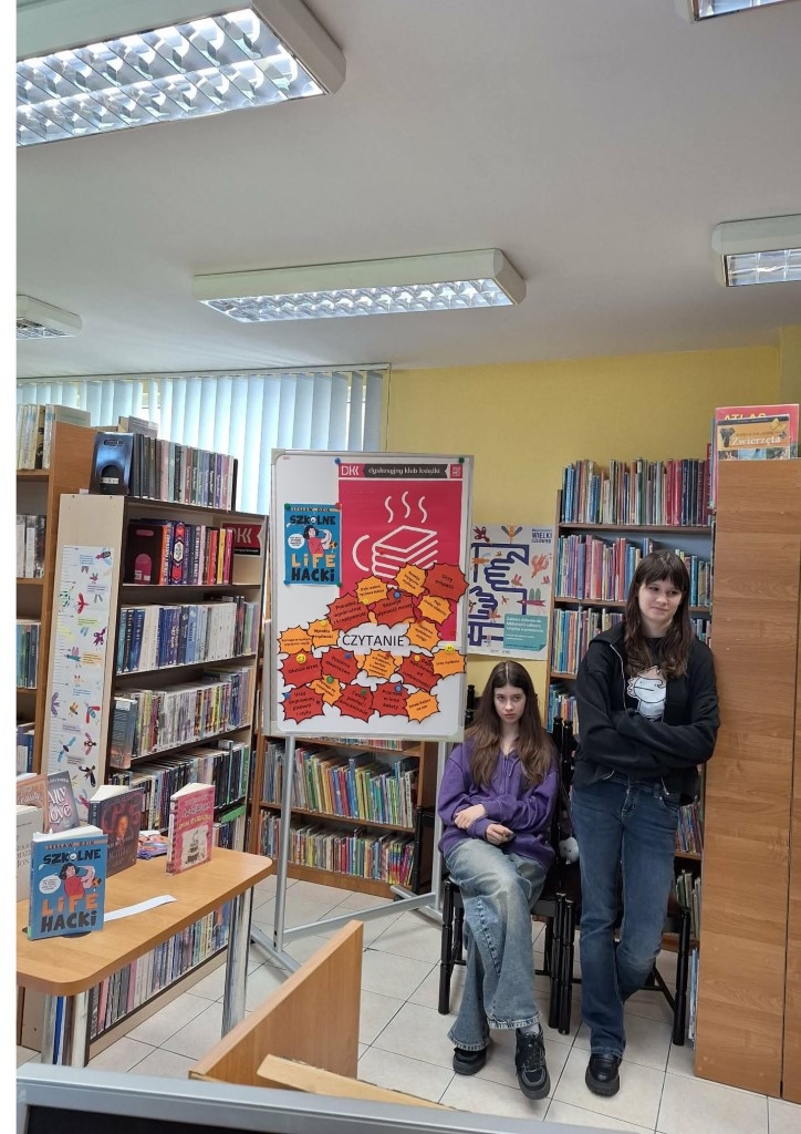 10 kwietnia w naszej bibliotece odbyło się spotkanie, mające na celu promocję czytelnictwa wśród młodzieży. Uczestniczyła w nim klasa VIII e ze Szkoły Podstawowej nr 2 wraz z wychowawczynią Alicją Majewską. Spotkanie zostało zainicjowane przez uczestników Dyskusyjnego Klubu Książki dla dzieci i młodzieży, który działa w naszej placówce od 2022 roku. Uczniowie zapoznali się z księgozbiorem adresowanym dla młodzieży, który zaprezentowała jedna z uczennic , aktywnie uczestnicząca w spotkaniach DKK od początku jego działania. Ważnym punktem była prezentacja książki pt. „Szkolne lifehacki” autorstwa Lesława Dzika – popularnego youtubera i tiktokera. Ta motywująca książka zawiera wiele pomocnych porad i trików pomagających w uczeniu się, a także rozwijaniu swoich pasji. Serdecznie zachęcamy wszystkich uczniów do zapoznania się z treścią książki i wdrażania szkolnych lifehacków.