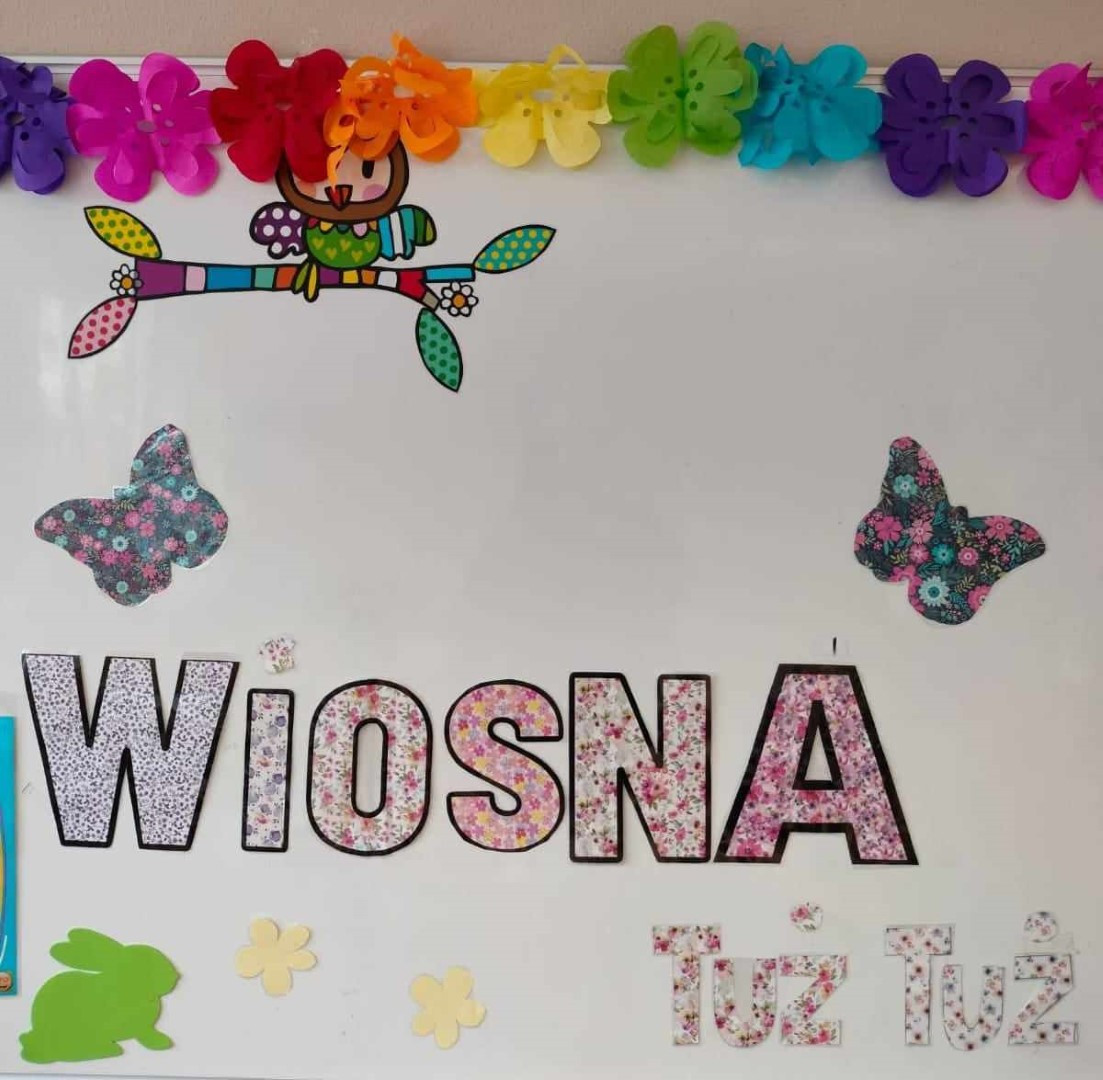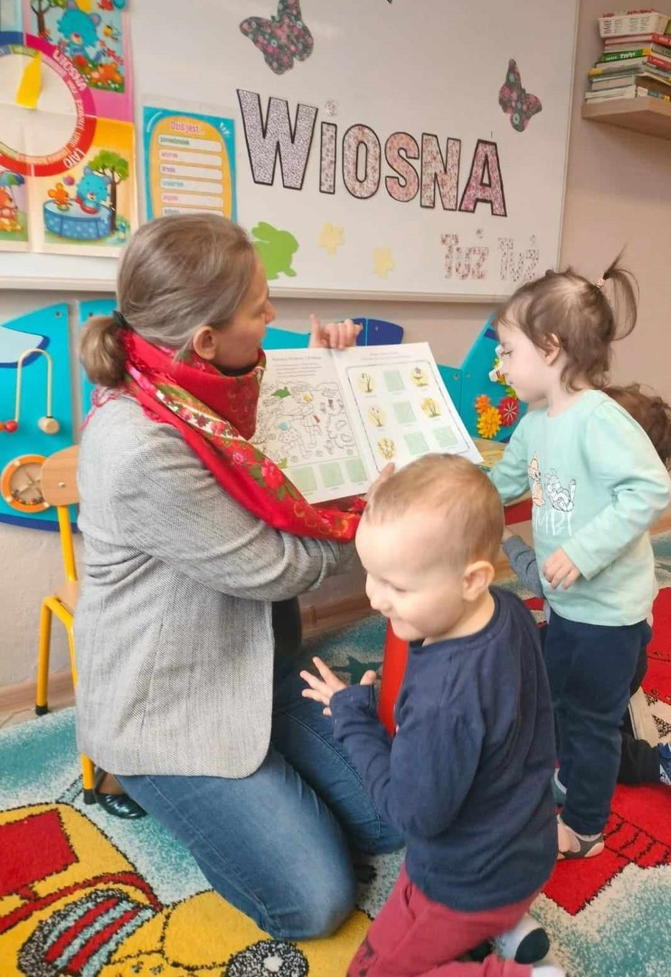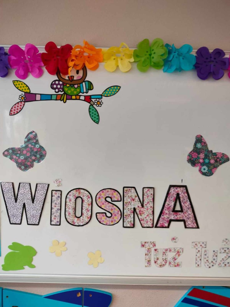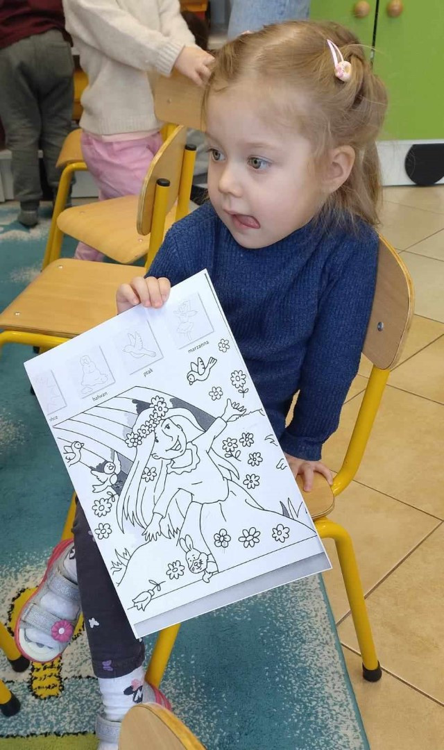 Następnie rozpoznawali na obrazkach pierwsze kwiaty i drzewa kwitnące wiosną. Dzieci mogły też nakleić rozpoznane: przebiśniegi, tulipany, konwalie czy gałązki wierzby i forsycji z książkowej układanki: „Wiosna” M. Czyżowskiej. Zgadywały także które zwierzątka i ptaki budzą się wiosną i przyleciały już z ciepłych krajów. Prowadząca pokazała dzieciom prawdziwe „kotki” bazie, które mieszkają na drzewach wierzby i zachęciła do obejrzenia forsycji, która zakwitła już przed żłobkiem. Na zakończenie dzieci wysłuchały z bibliotekarką piosenki „ Maszeruje wiosna” i otrzymały kolorowankę z portretem Pani Wiosny.